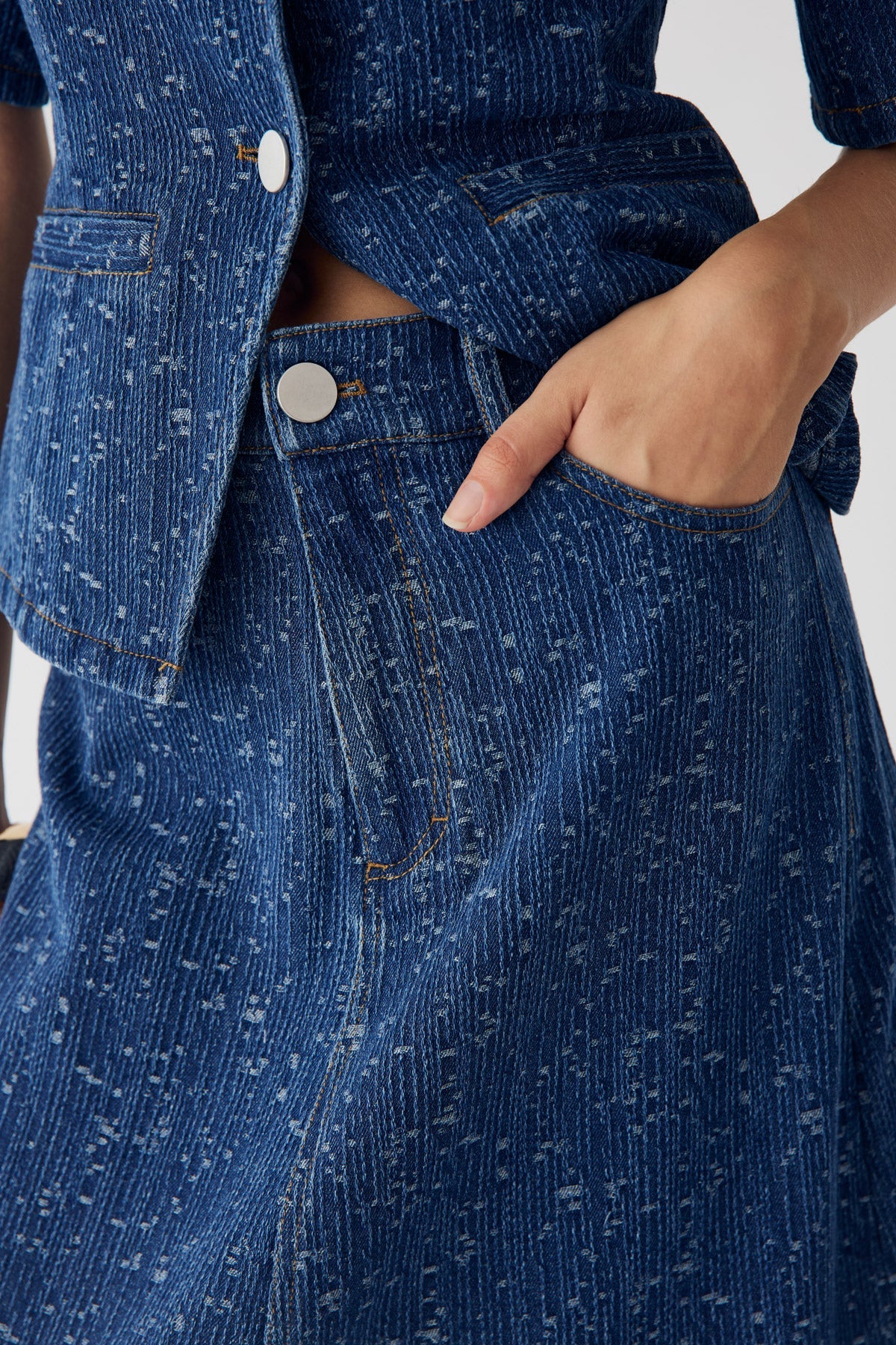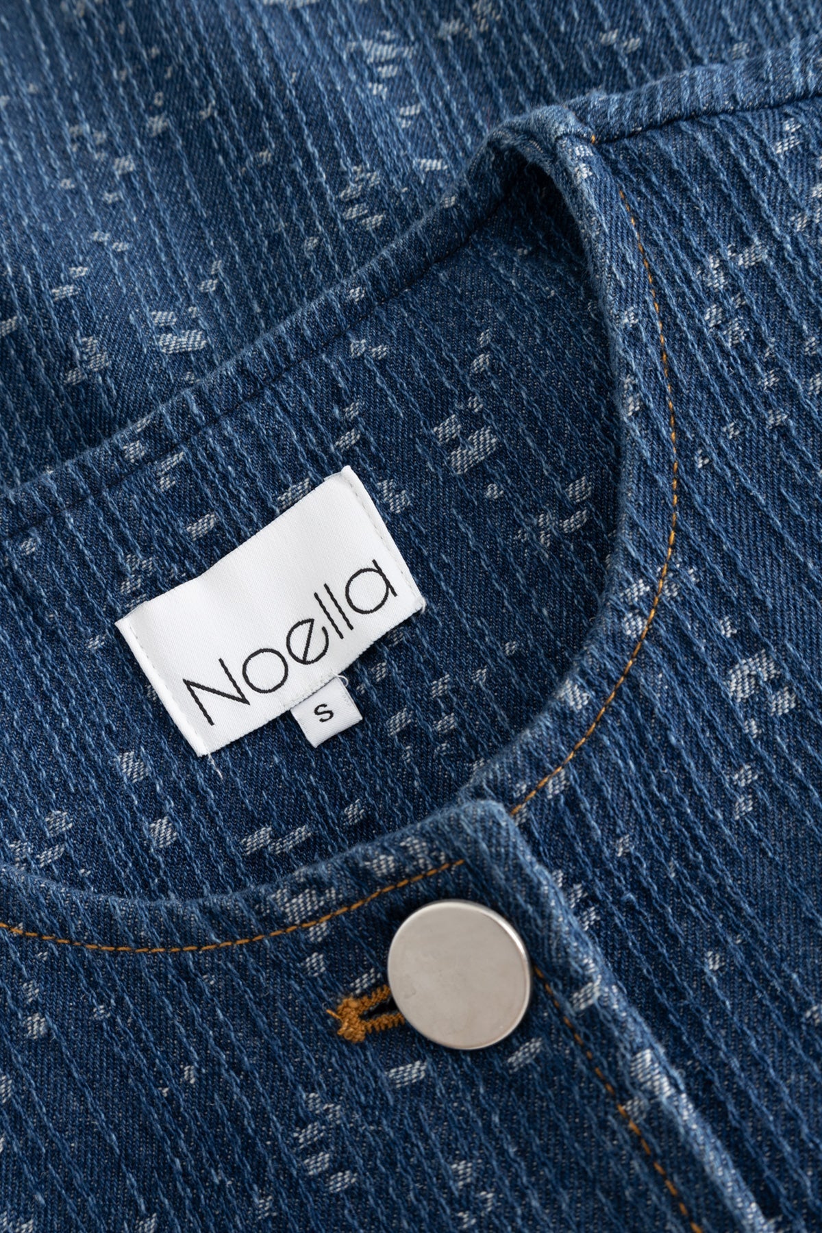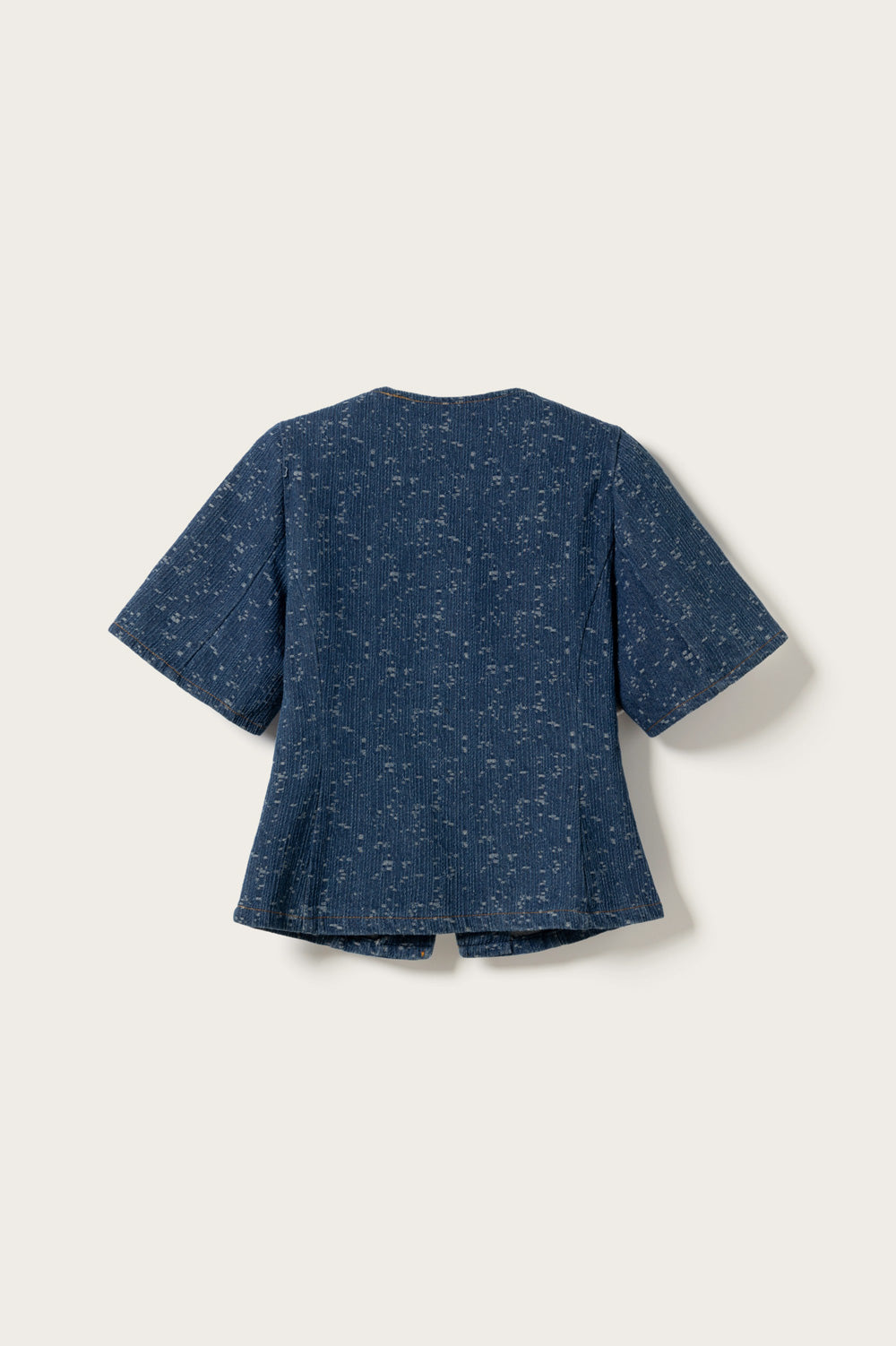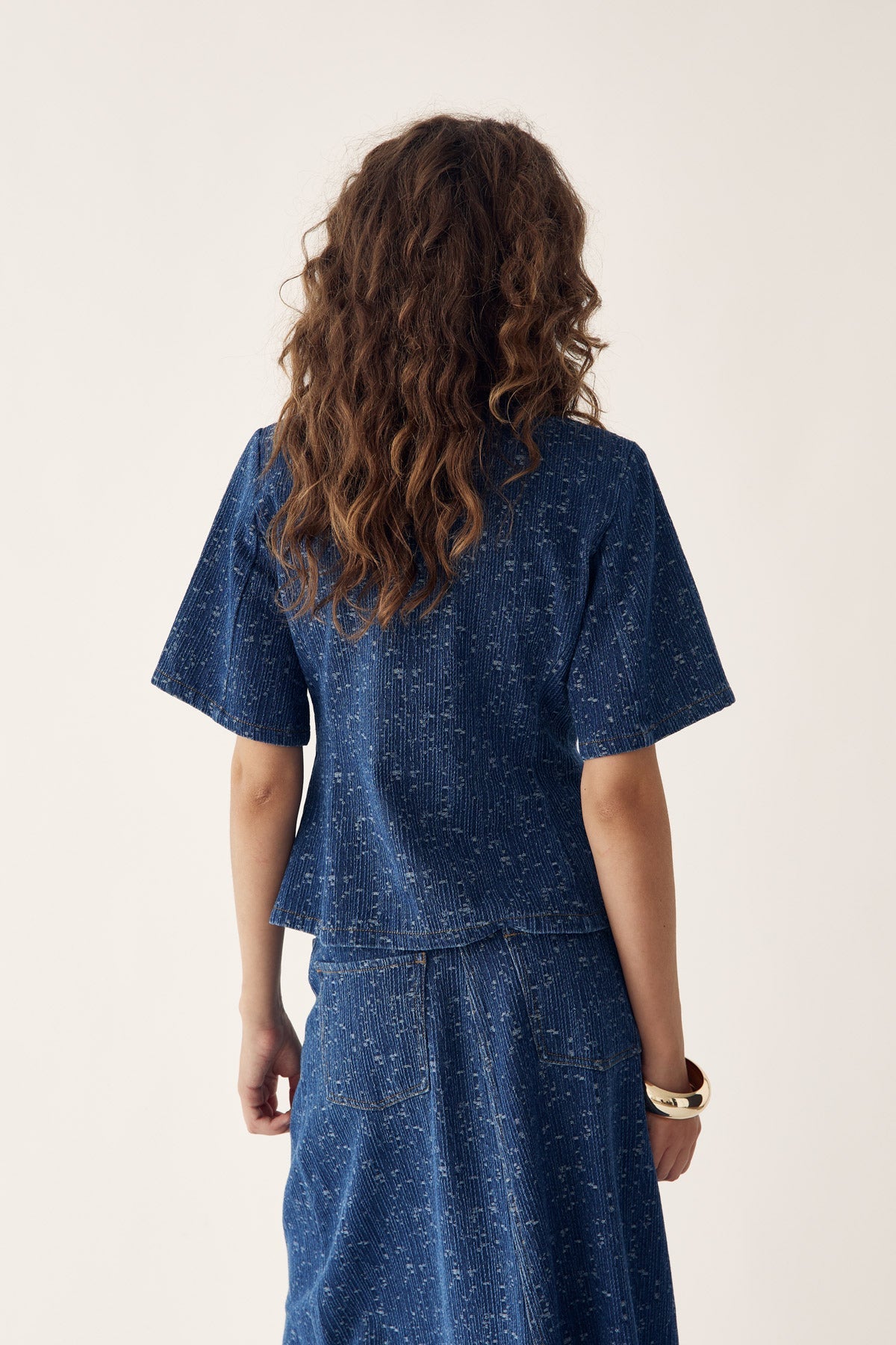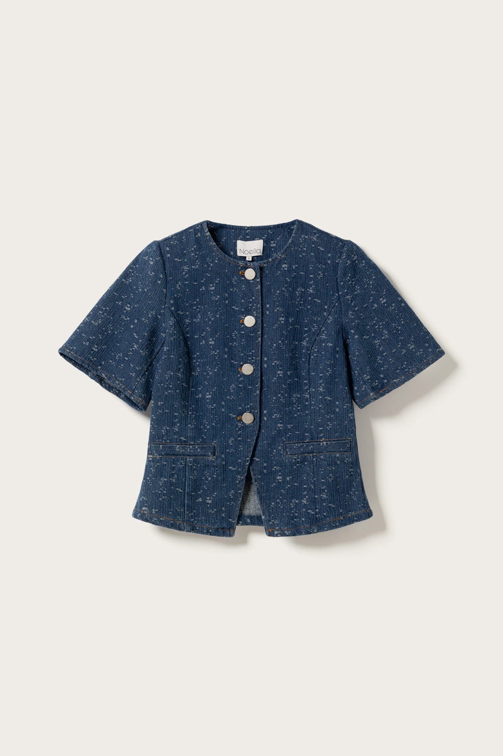 Kasaundra Blazer is a short-sleeved denim blazer with front slanted pockets and a tailored fit. Style Kasaundra Blazer with Lyndall Skirt for a complete and coordinated look.