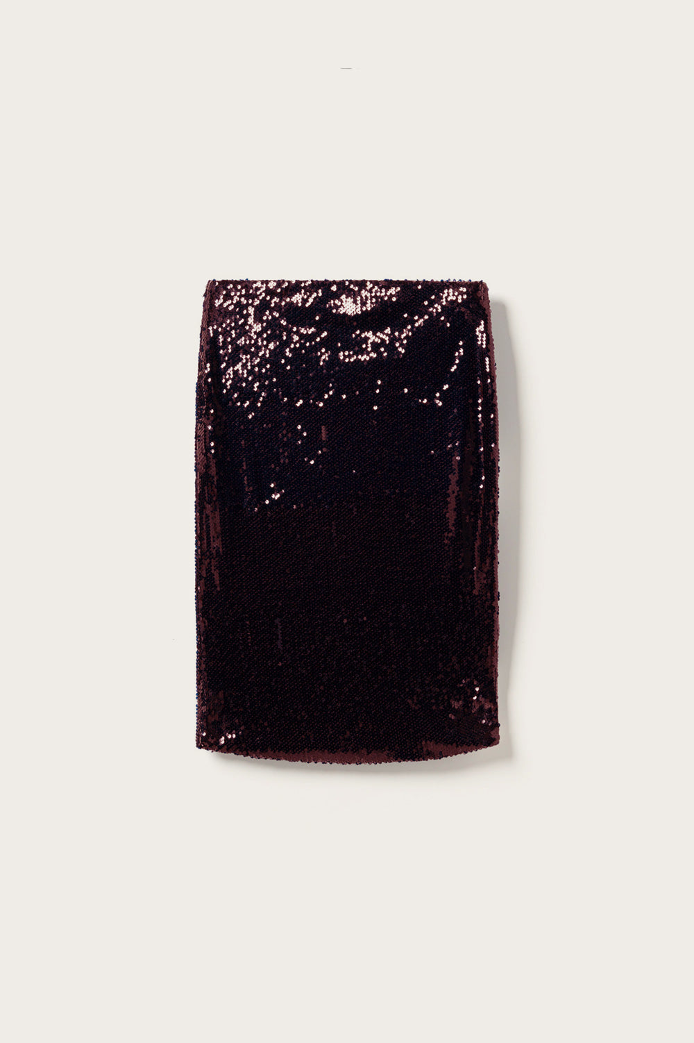 Kayden Long Skirt is a midi-length skirt with sequins and a side zip closure.