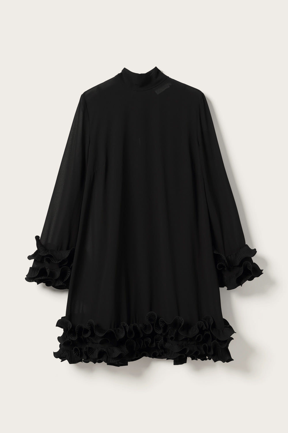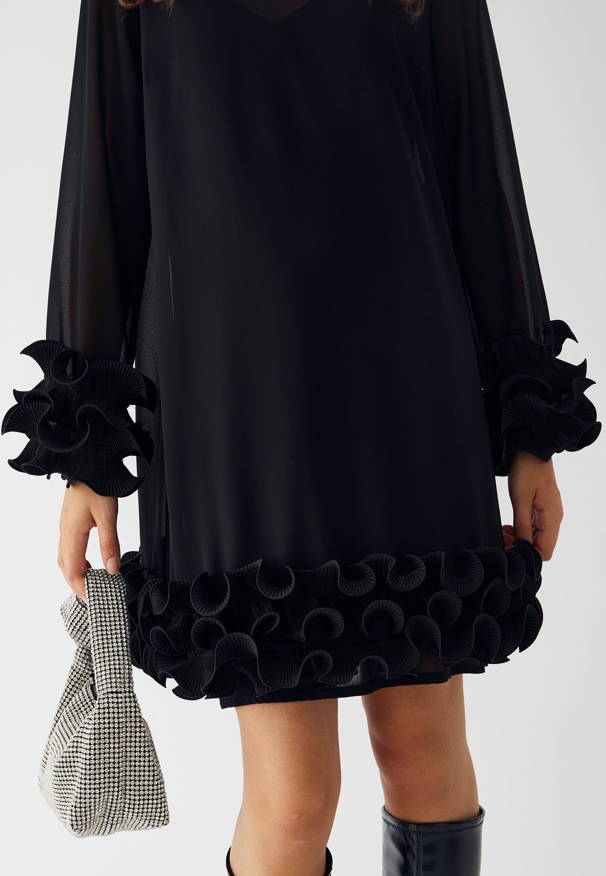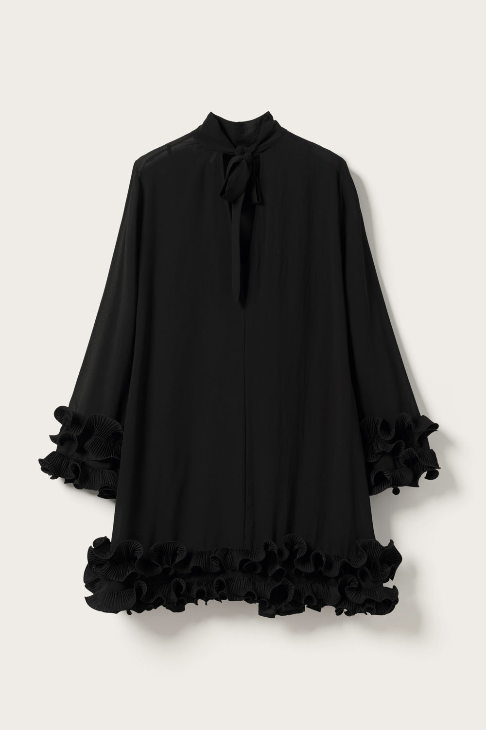 Latania Dress is a short black dress with delicate ruffle details at the edges. The dress has a loose fit with a high round neckline where the closure is a bow.
