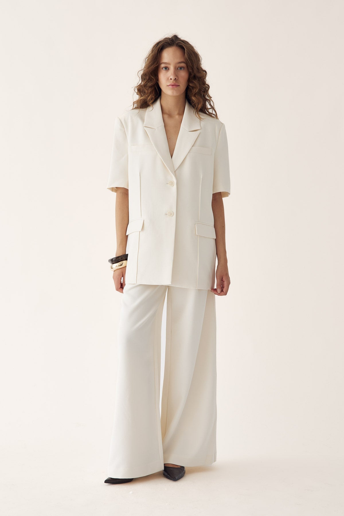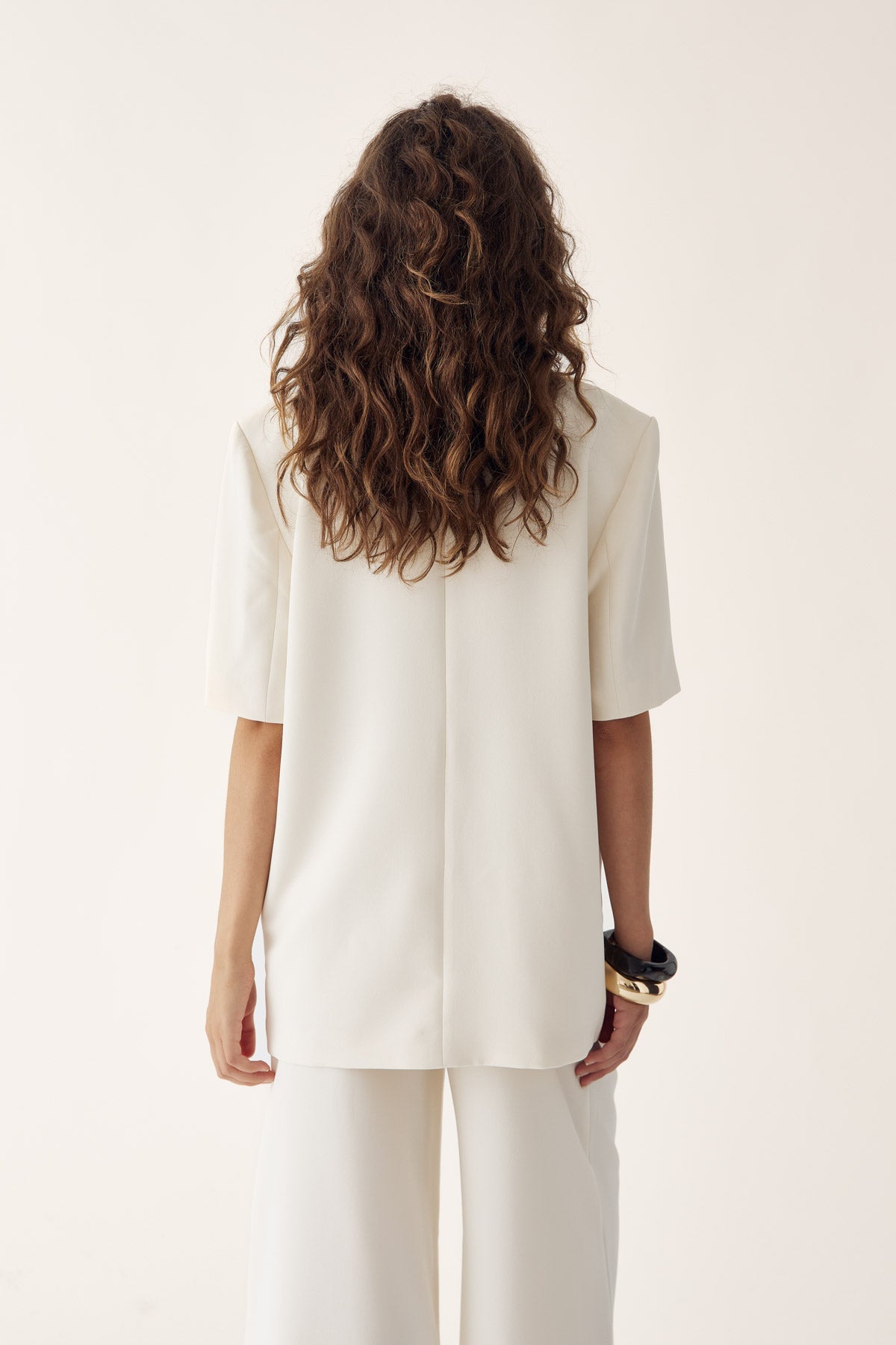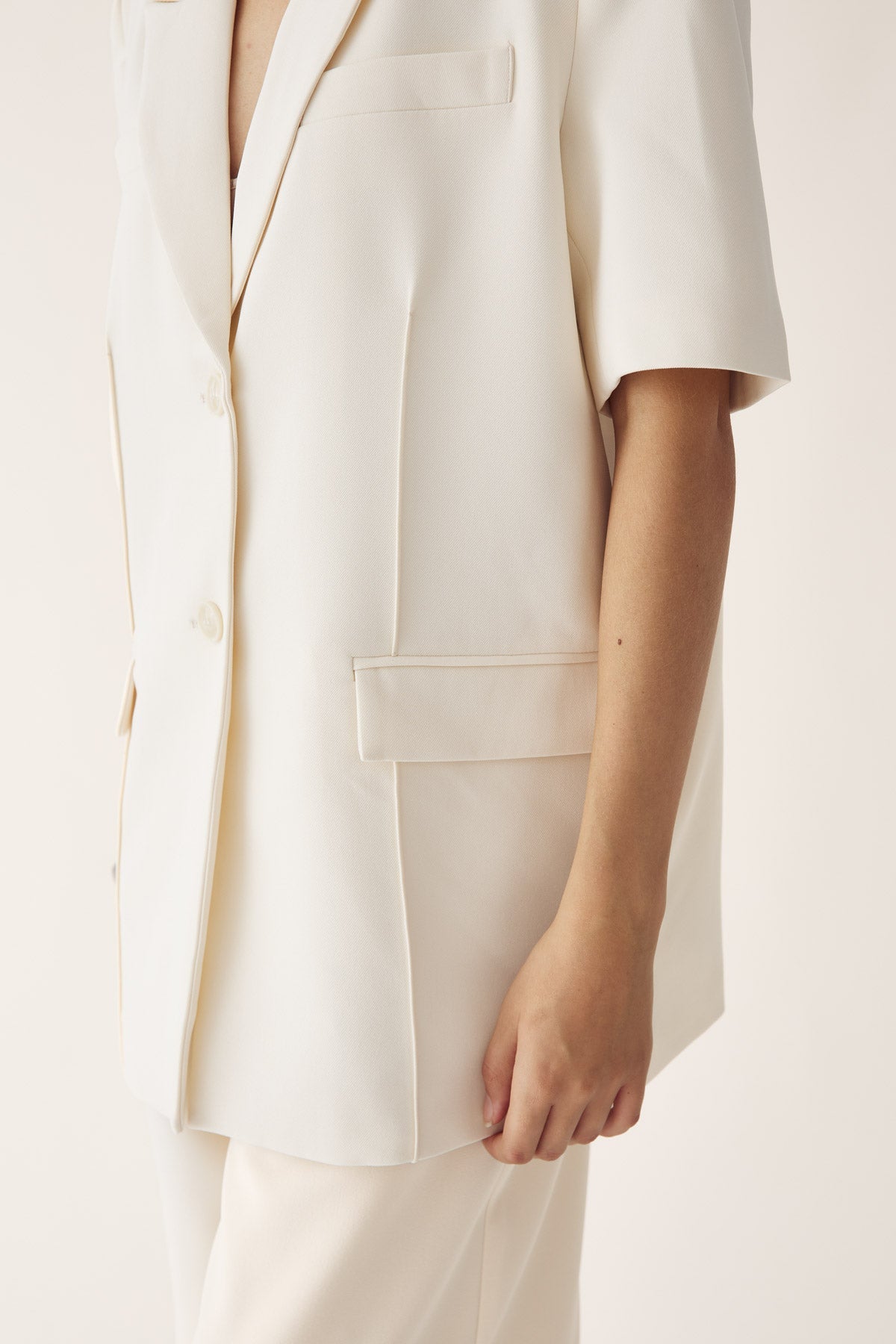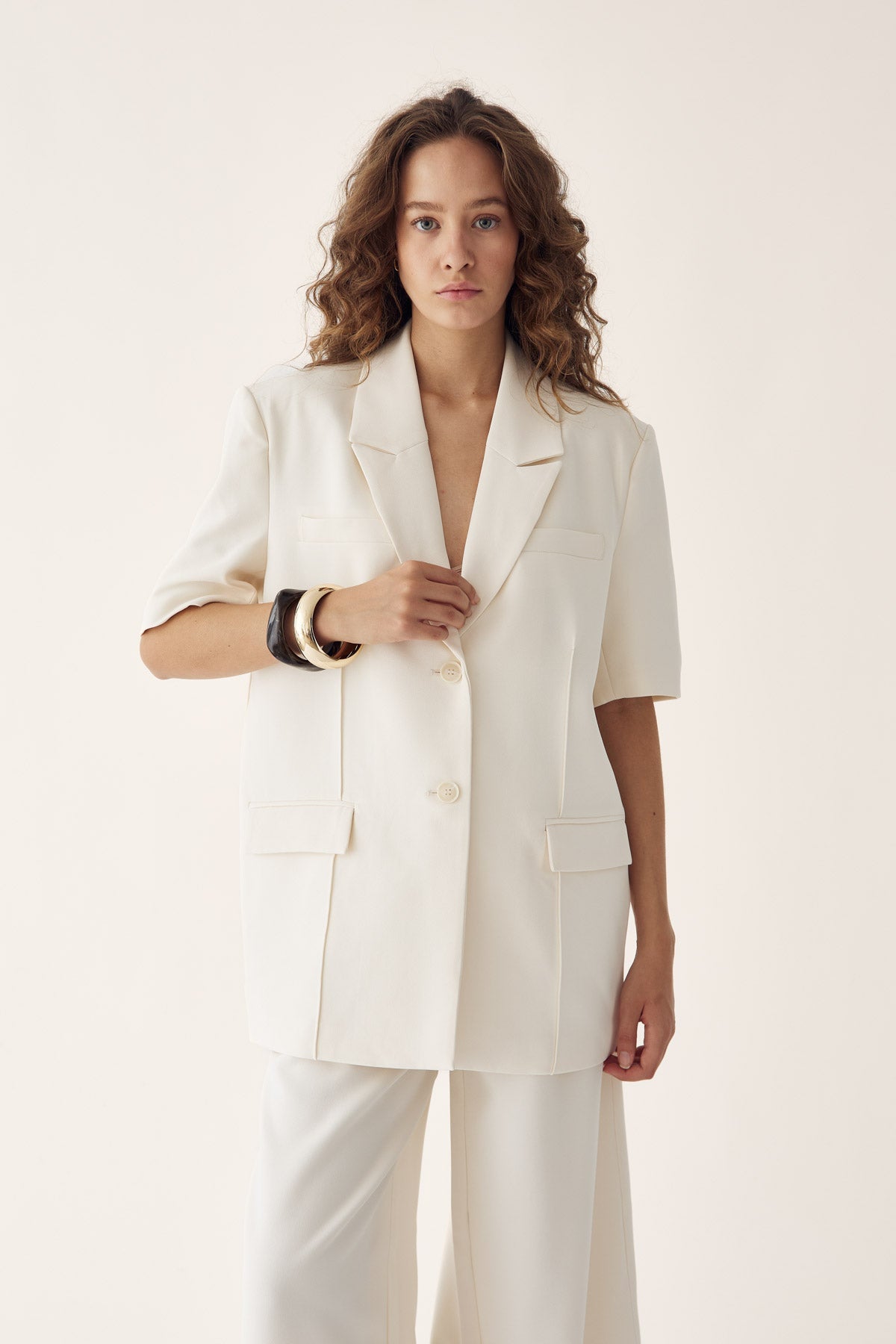 Leanne Blazer is a short-sleeved blazer with pockets and darts at the front. The Leanne Blazer has an oversized fit.