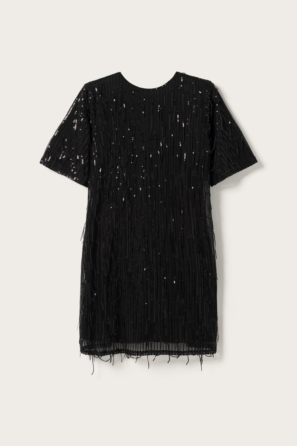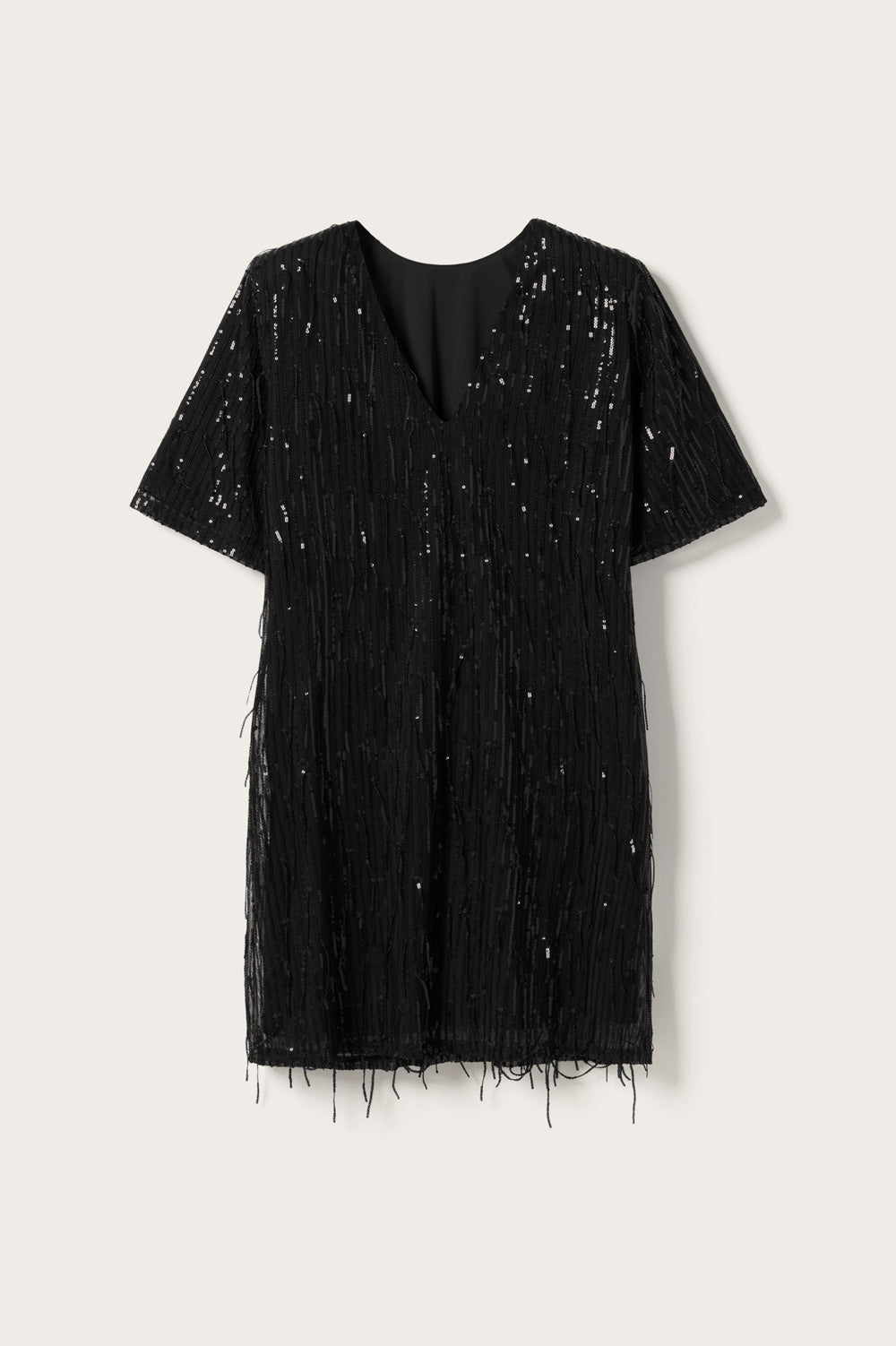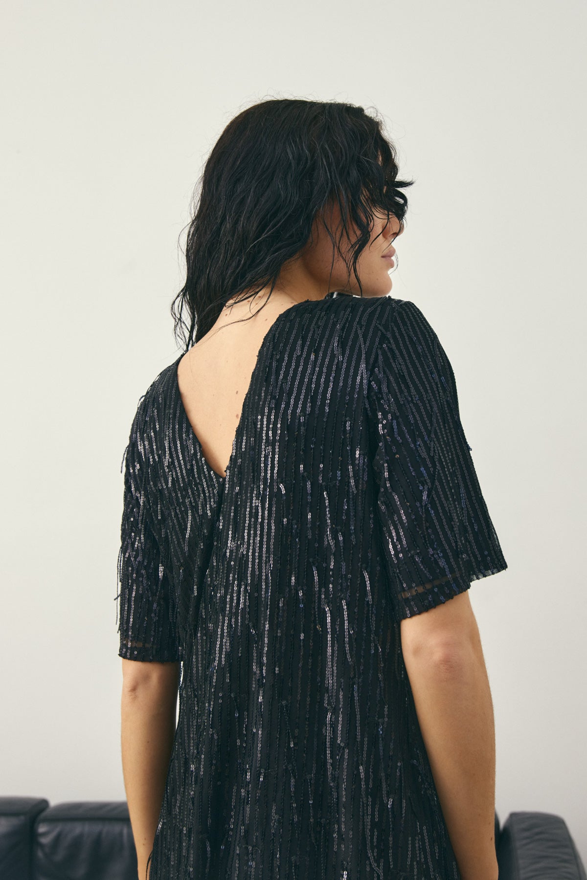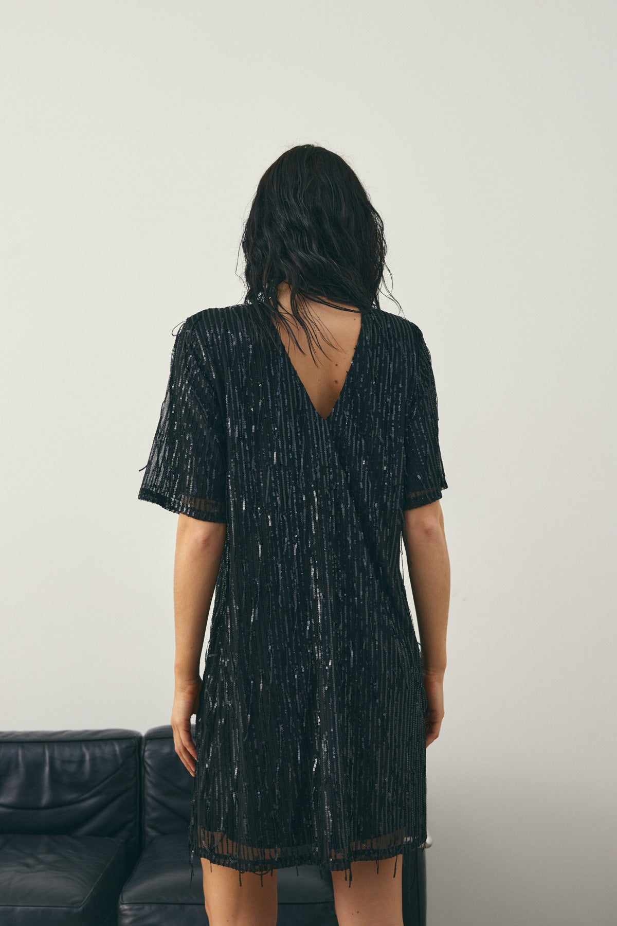 Leeann Dress is a short T-shirt dress with sequins and a deep V-back neckline. Leeann Dress is perfect for festive occasions and can be styled with heels and a cool bag for a stylish party look.