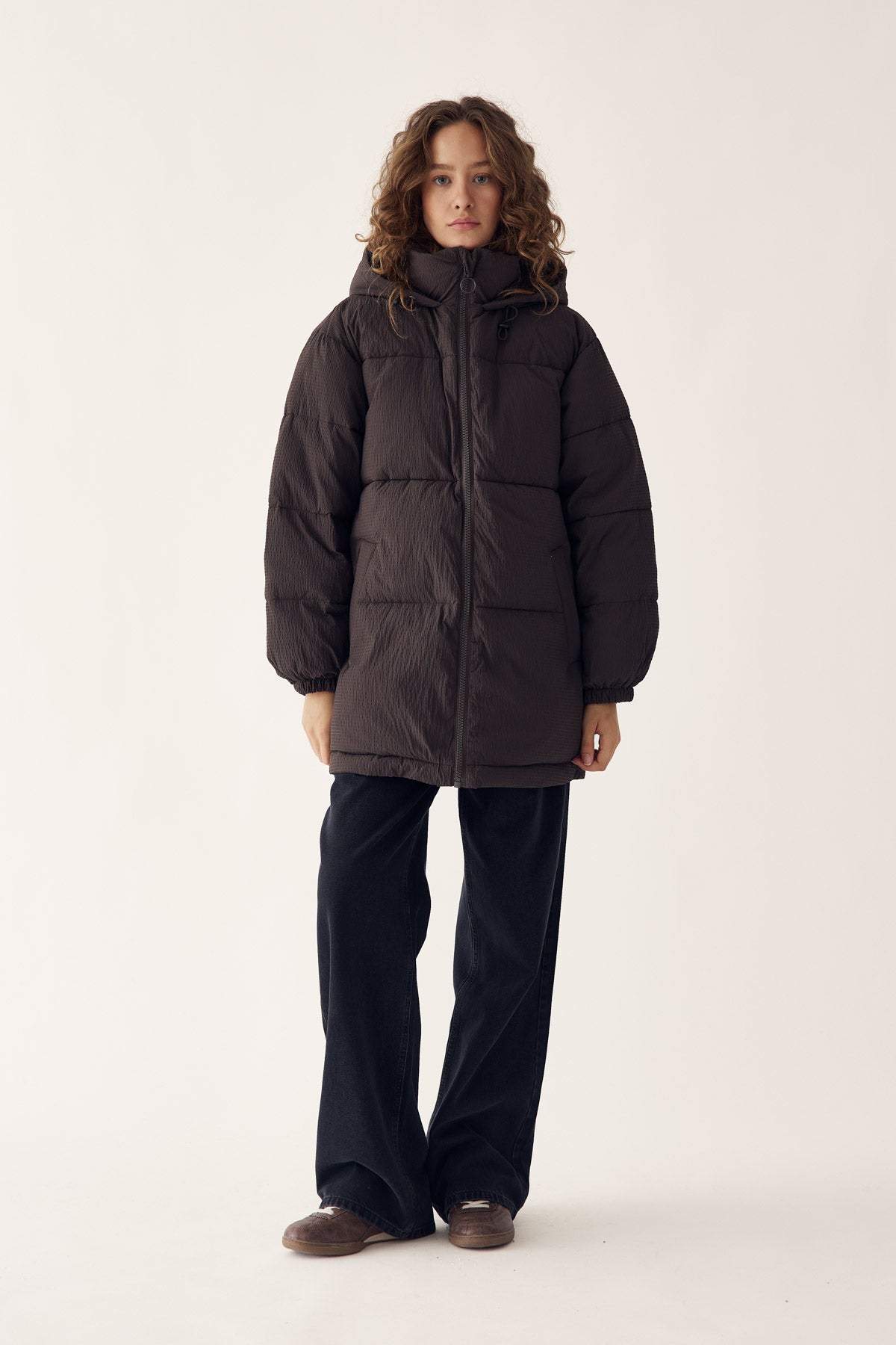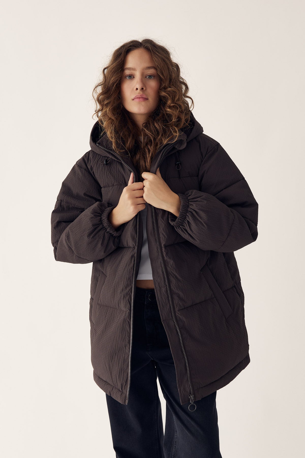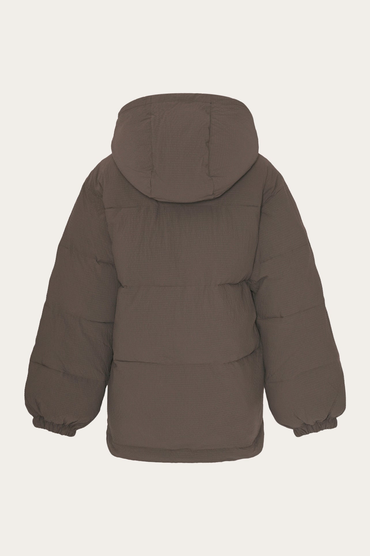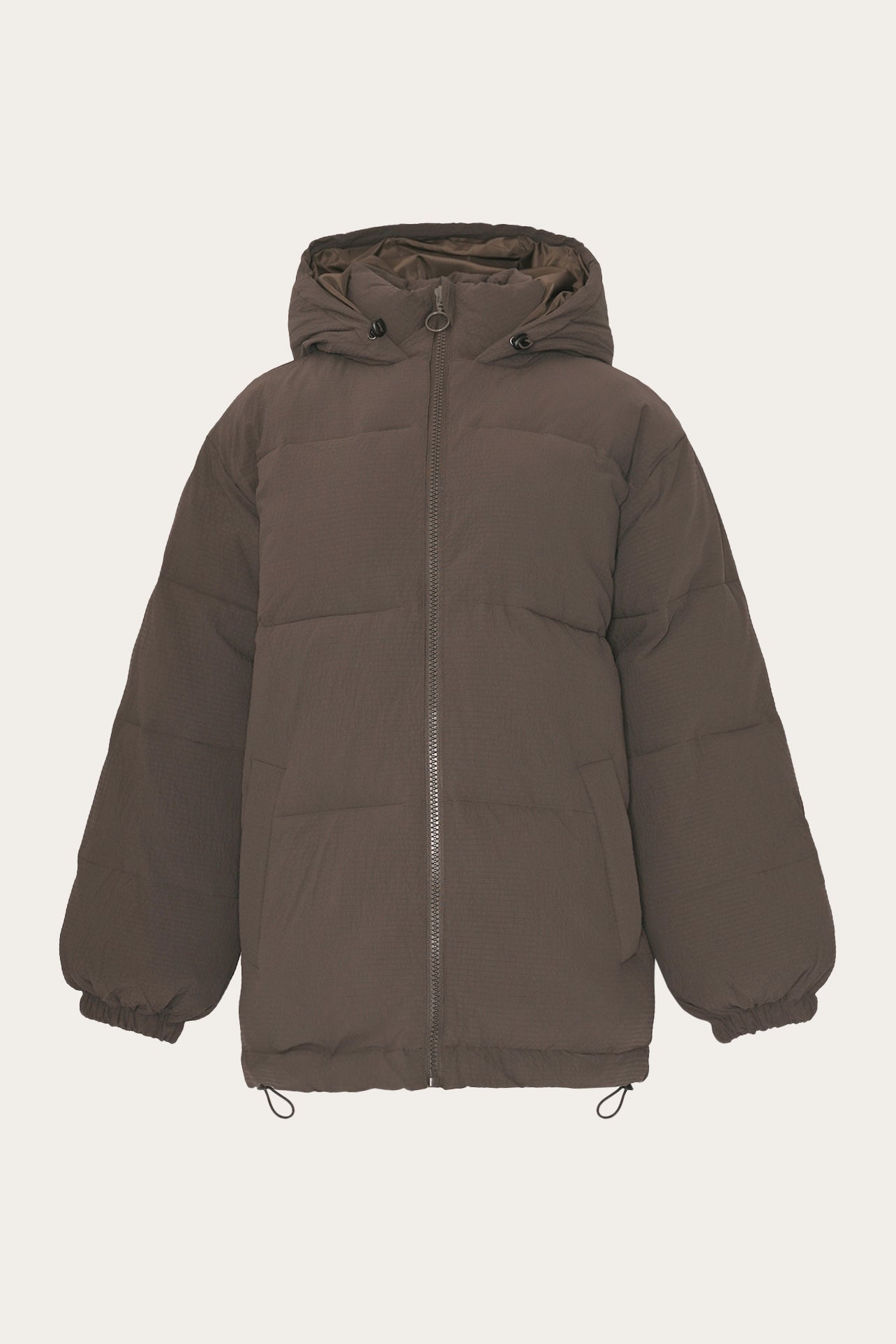 Leister Jacket is a mid-length puffer jacket with an adjustable hood and zipper. Leister Jacket has a loose and comfortable fit.