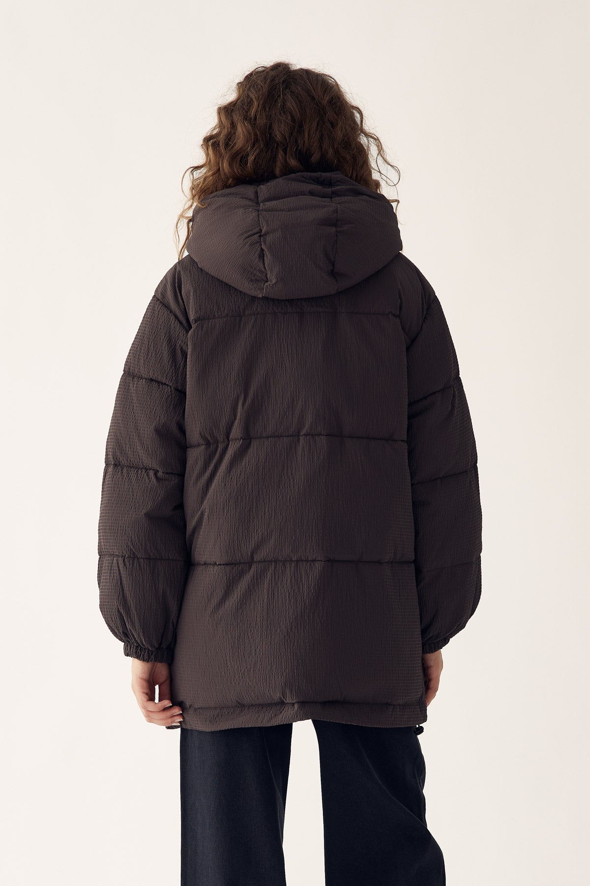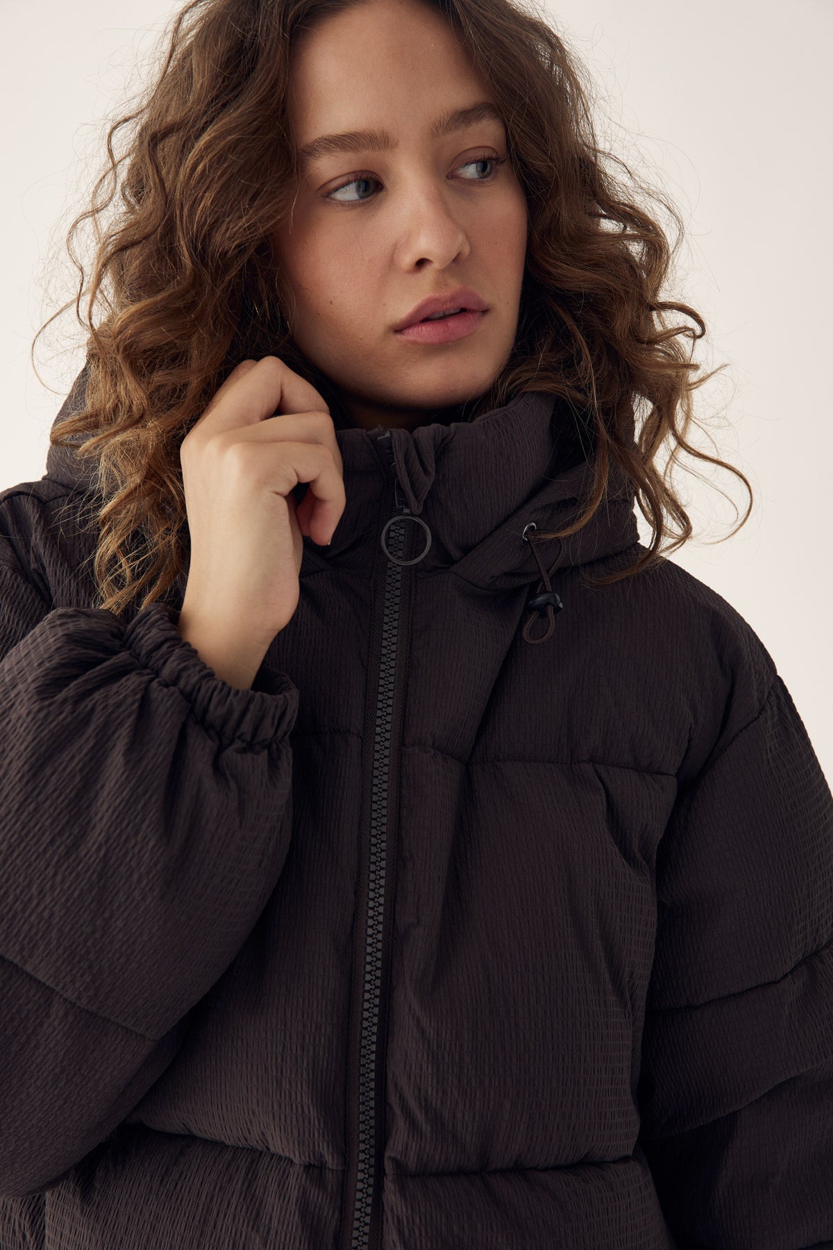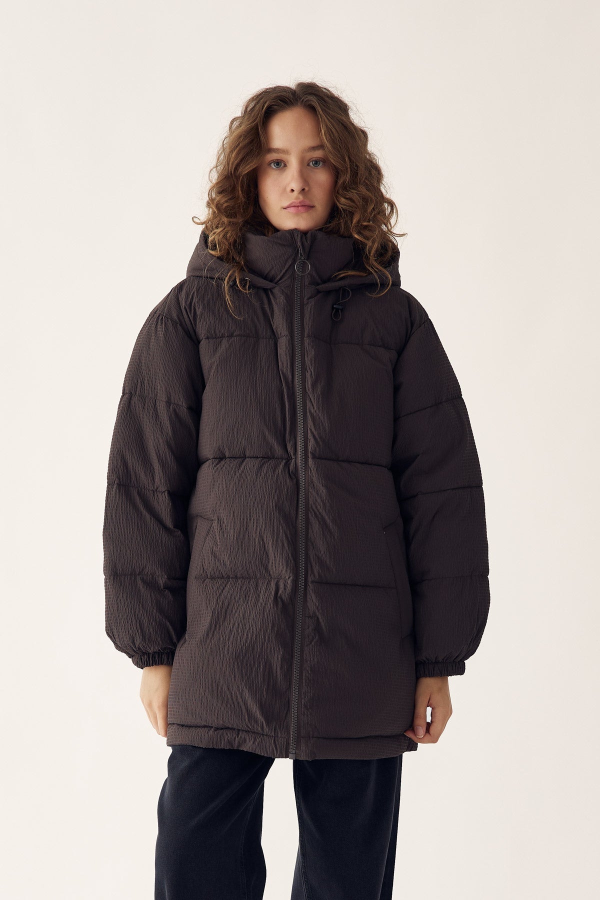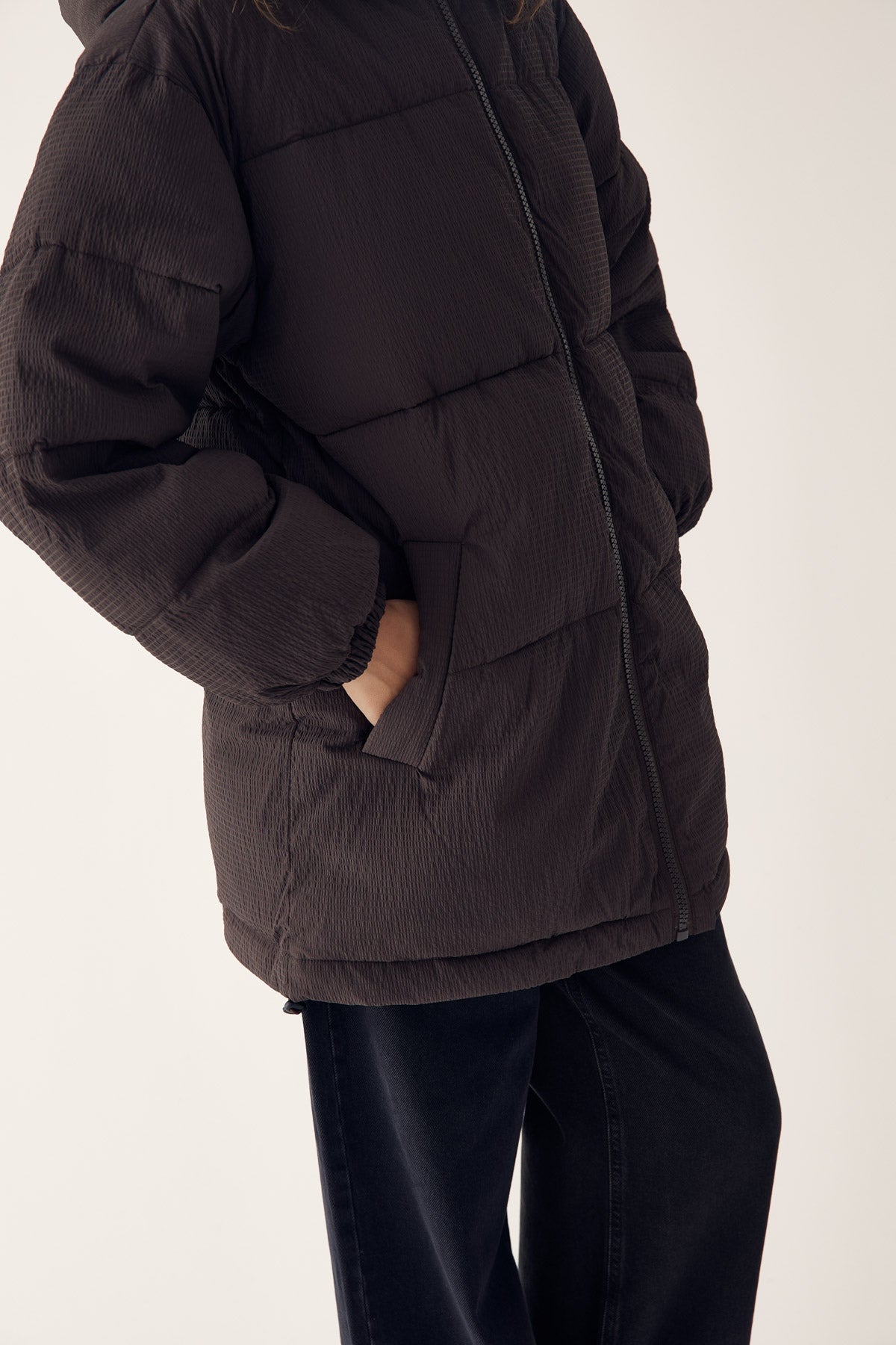 Leister Jacket is a mid-length puffer jacket with an adjustable hood and zipper. Leister Jacket has a loose and comfortable fit.