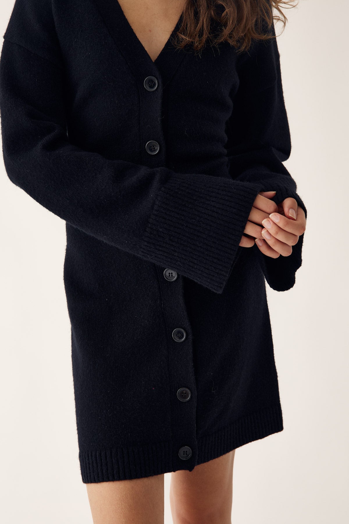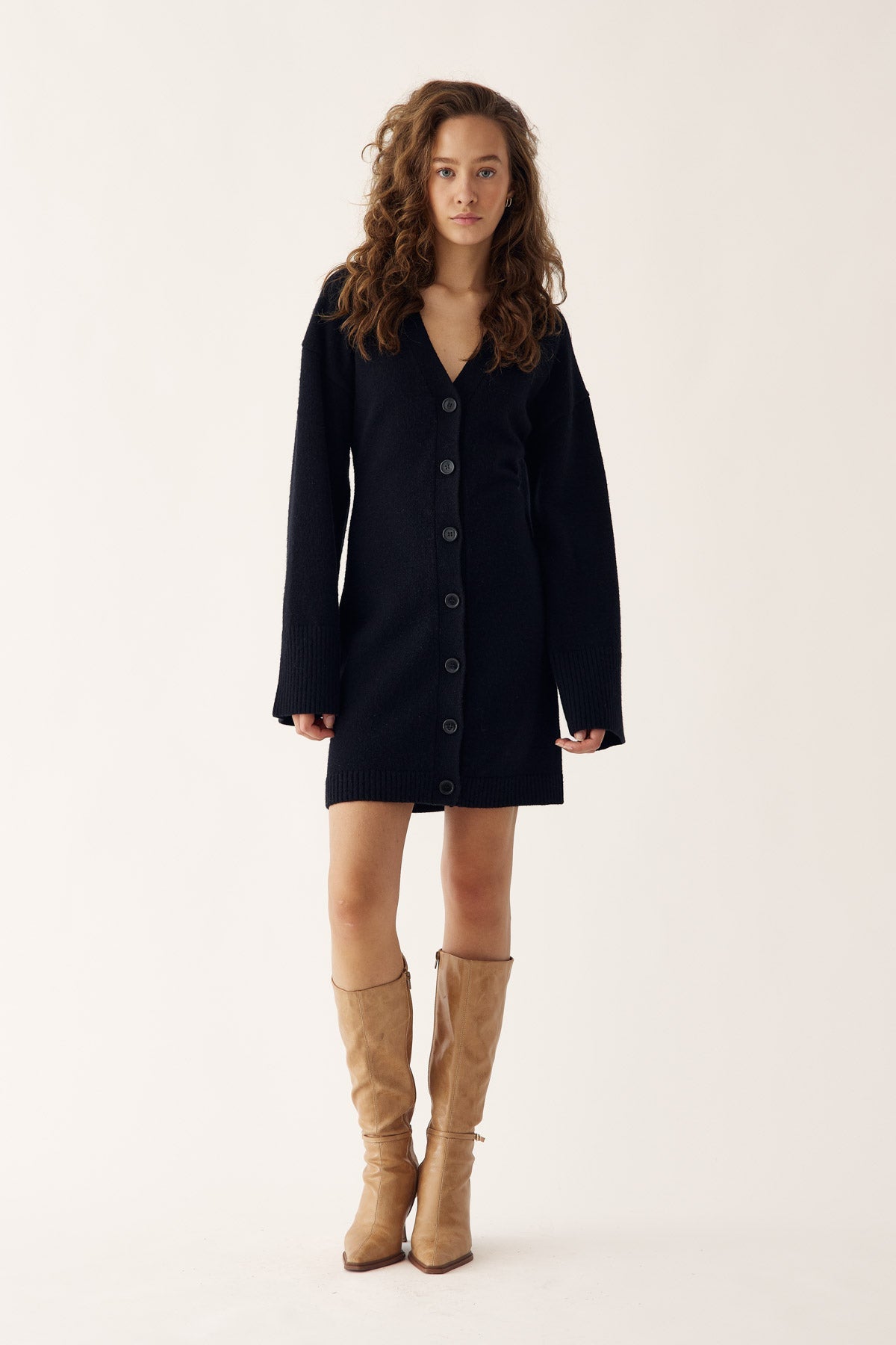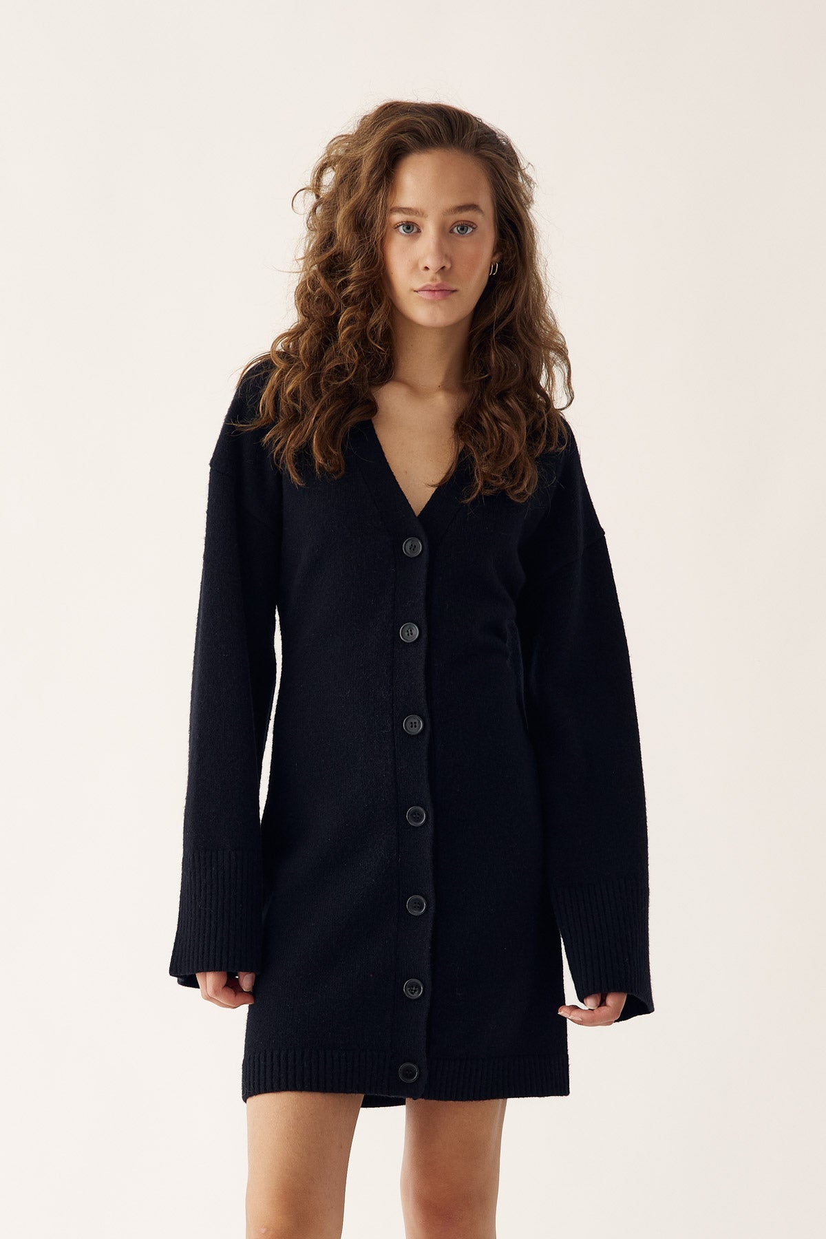 Lenyxanna Knit Dress is a cardigan dress with a fitted silhouette, long voluminous sleeves, and front button closure.