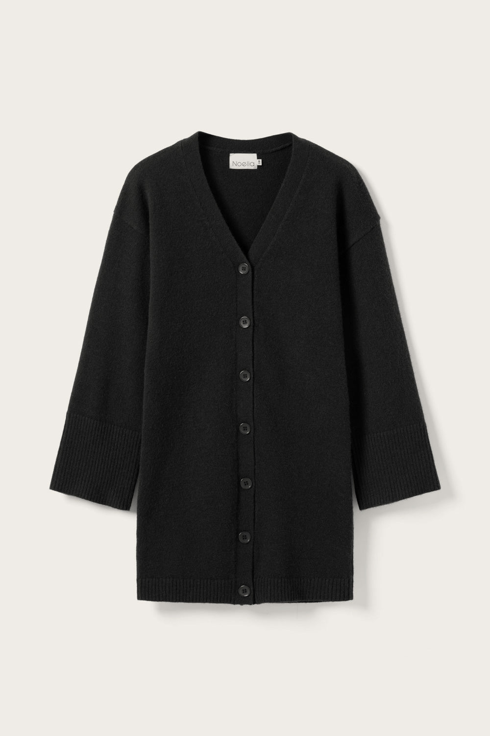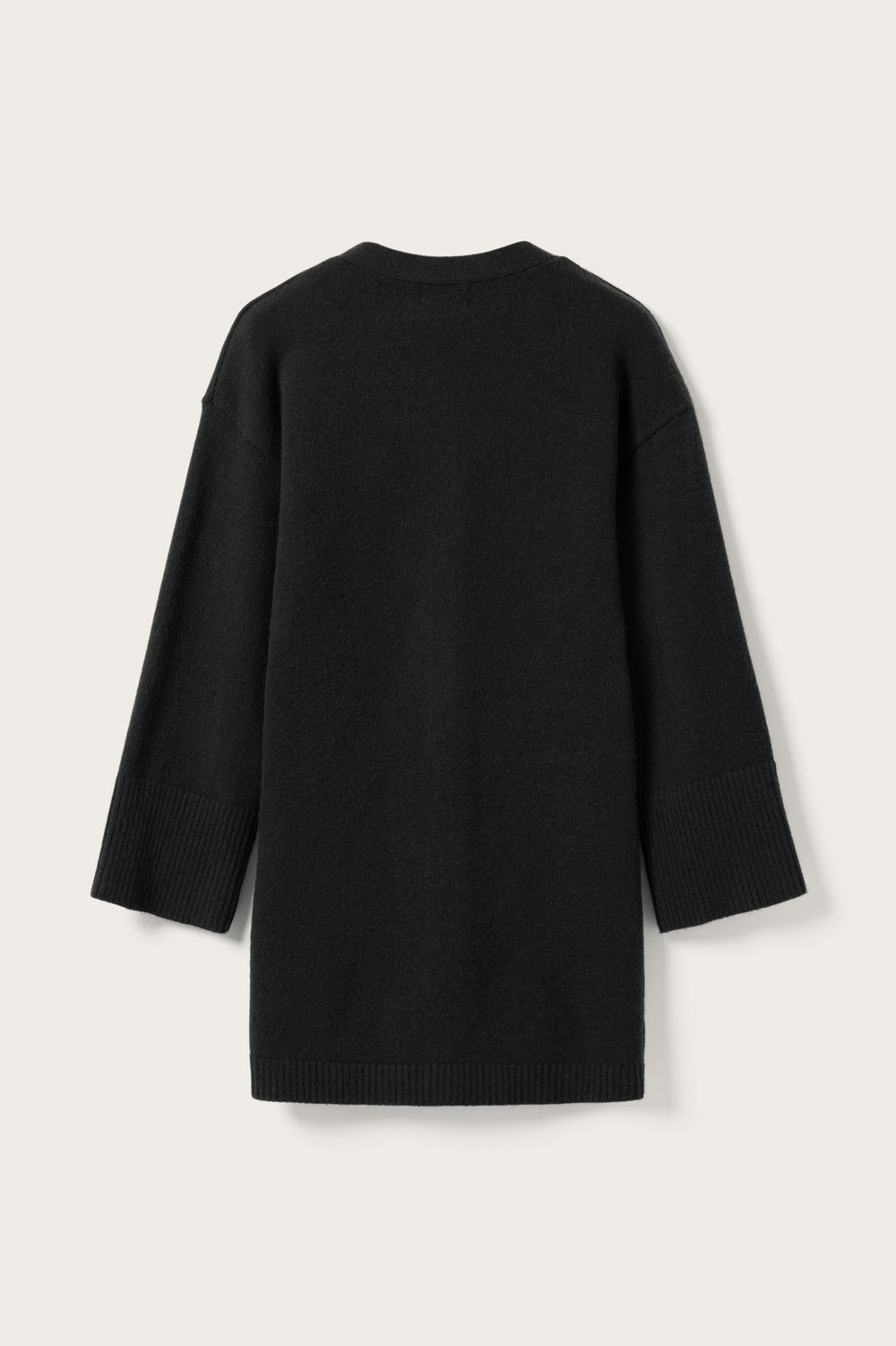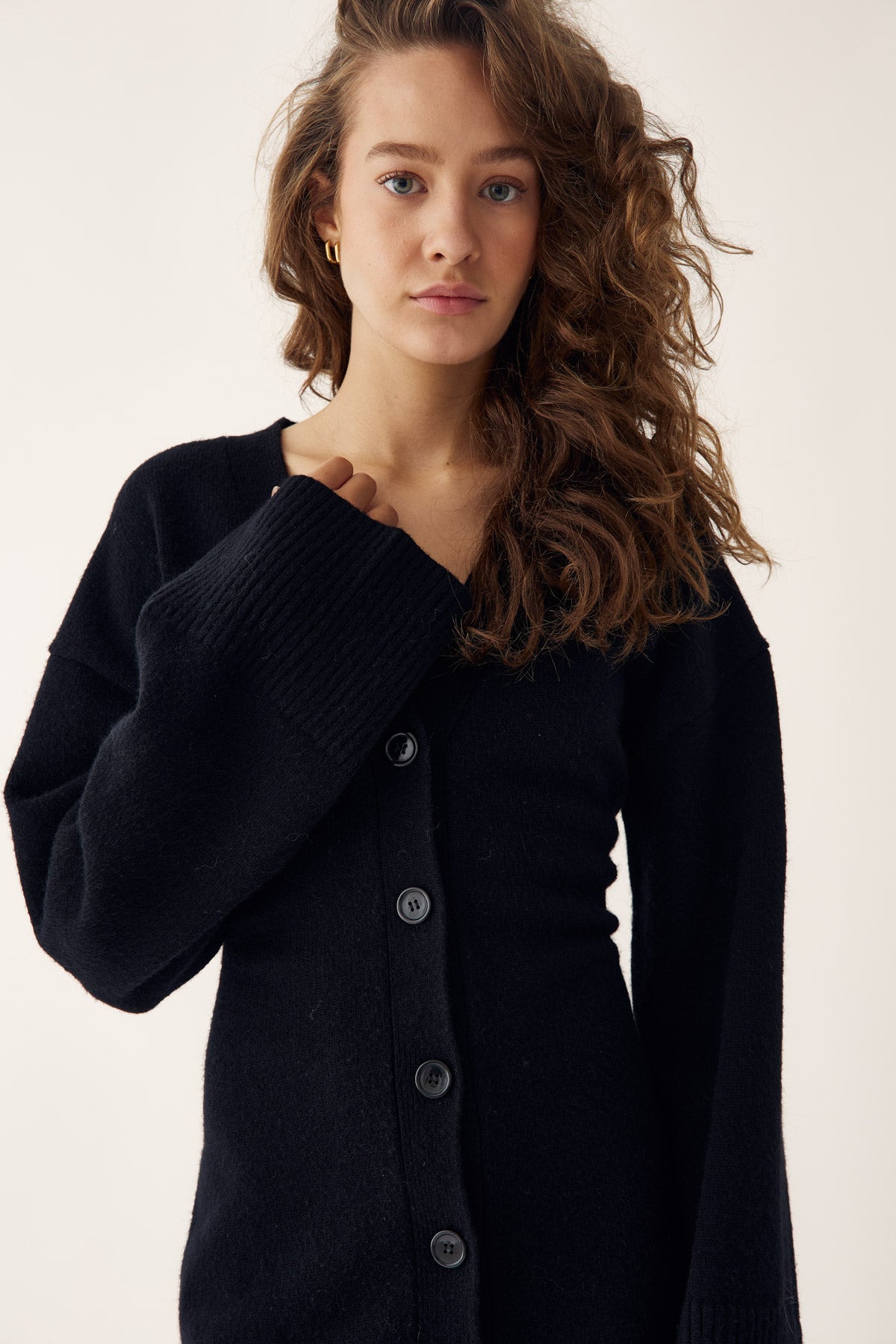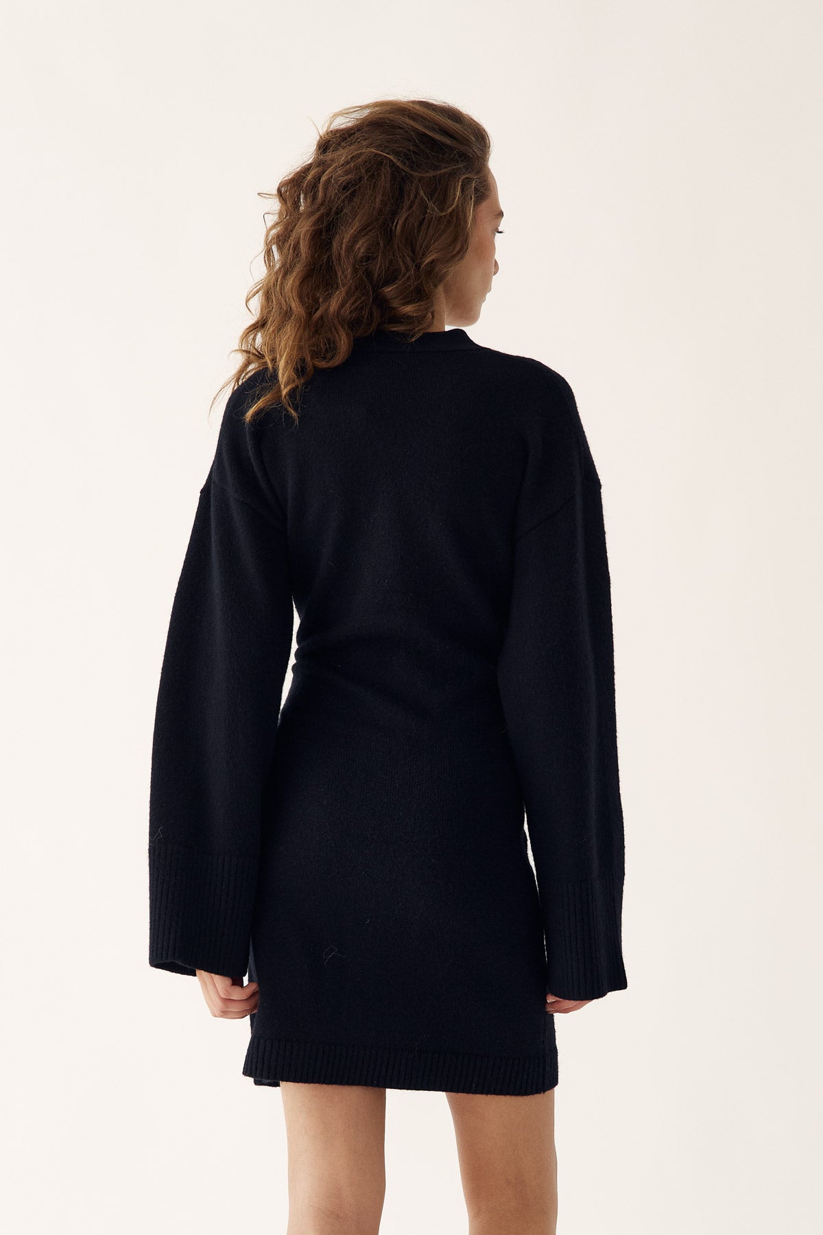 Lenyxanna Knit Dress is a cardigan dress with a fitted silhouette, long voluminous sleeves, and front button closure.