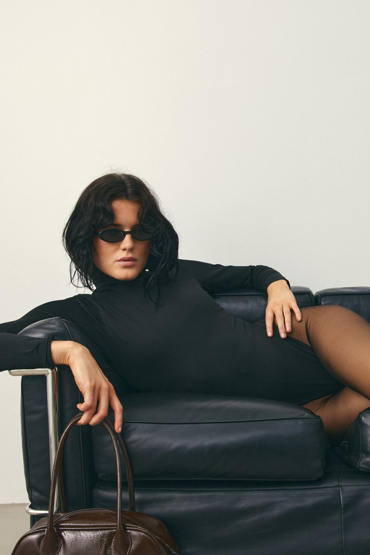 Lesley Bodystocking is a long-sleeved bodystocking with a high neckline. Crafted from soft and stretchy material, it has a tailored fit that creates a sleek and comfortable look. Pair it with jeans for an edgy outfit or dress it up with a blazer for a polished style.