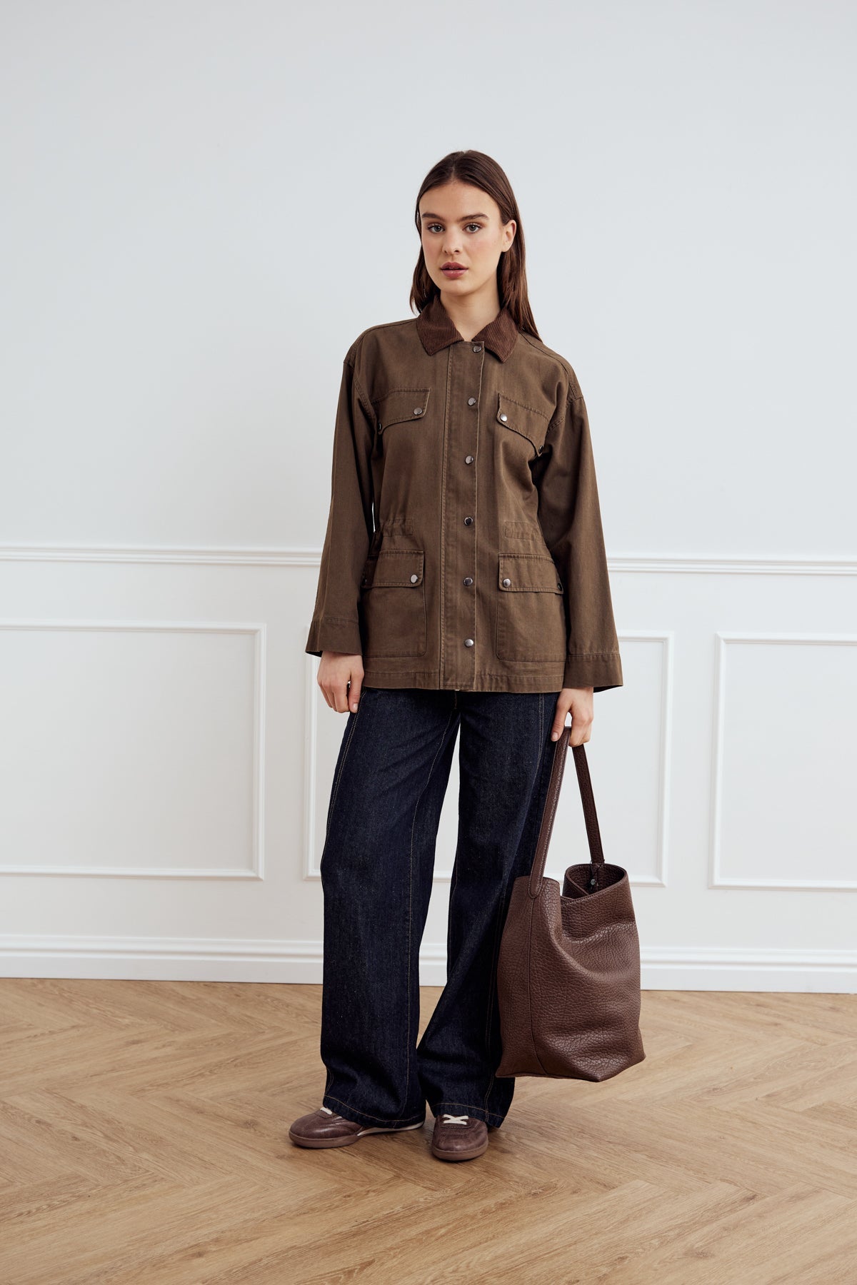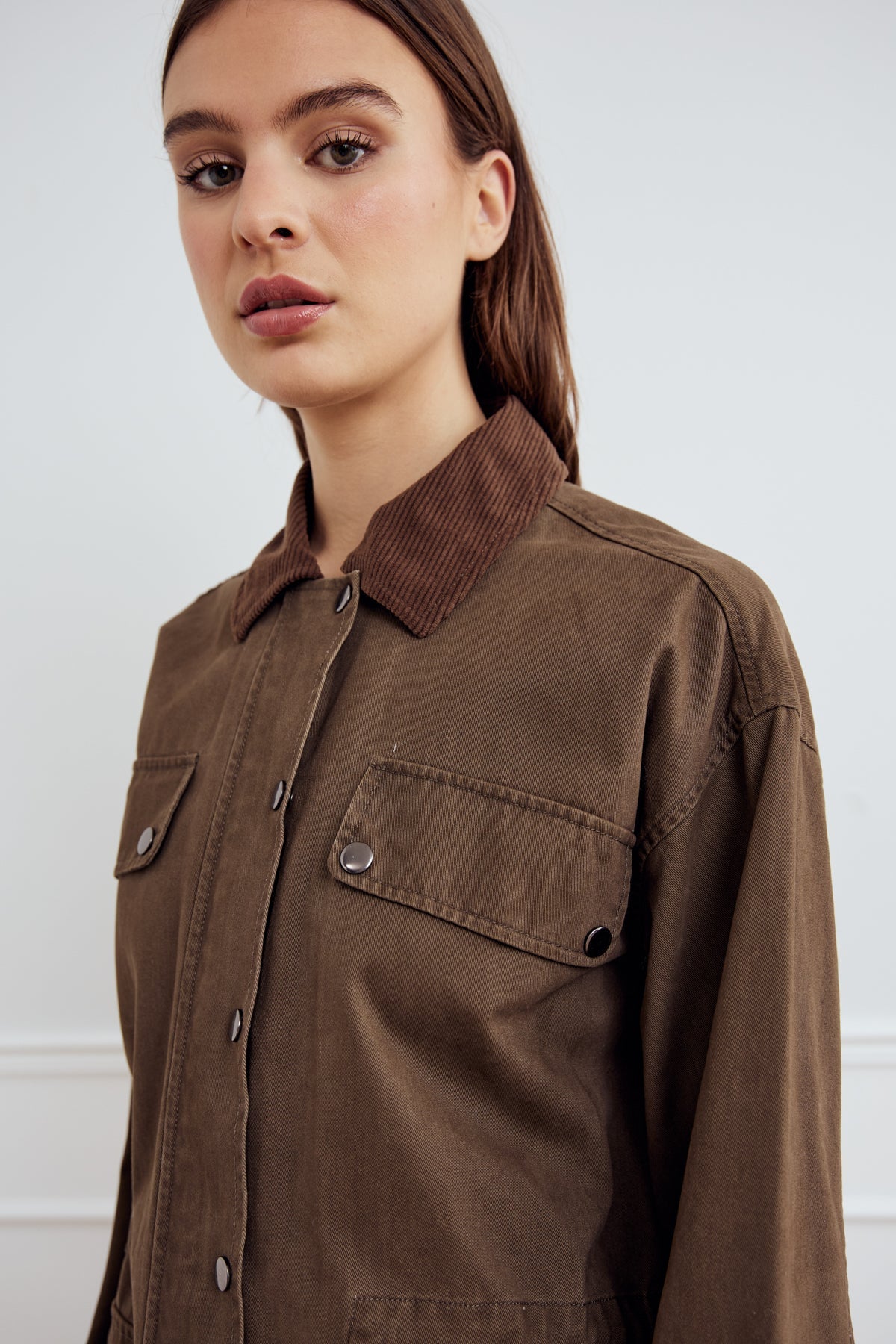 Classic jacket in 100 cotton with button closure, four pockets and a contrast collar. Regular fit and true to size.