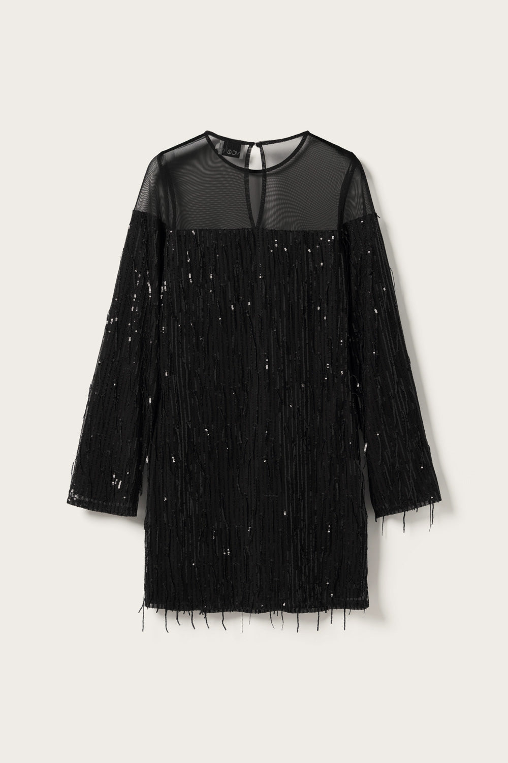 Leyah Dress is a short dress adorned with sparkling sequins and a mesh yoke detail. Ideal for festive occasions, it can be paired with heels for an elegant party look or with boots for a more edgy style.