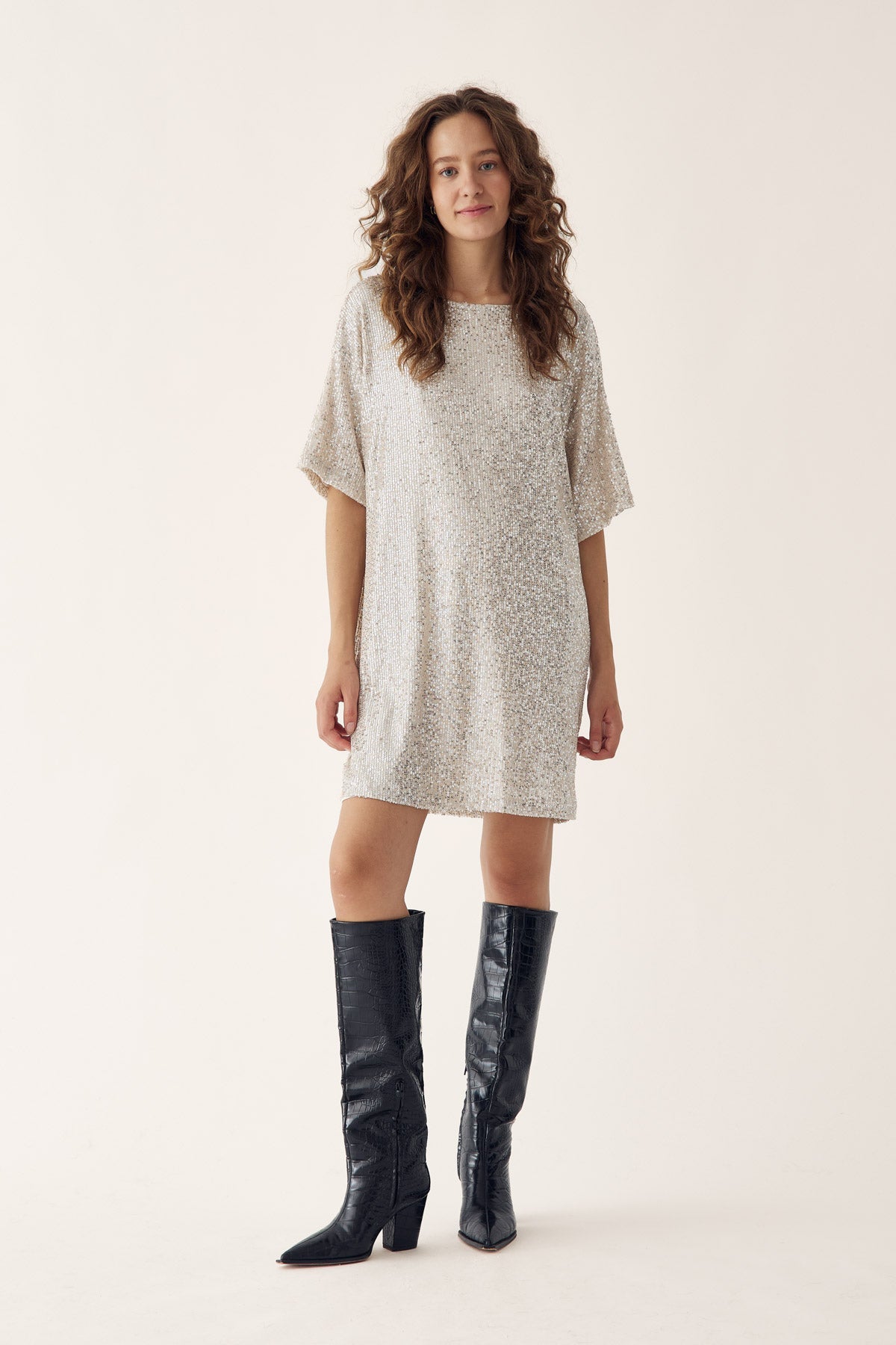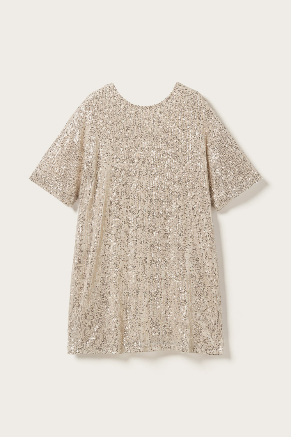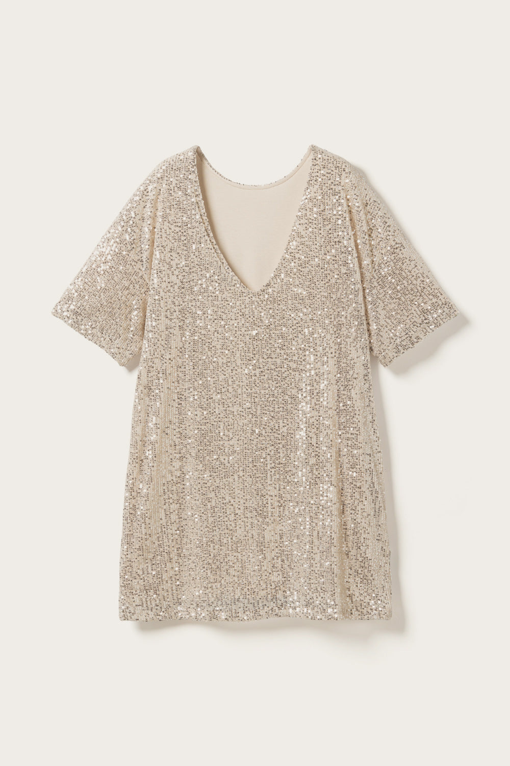 Lorah Dress is a T-shirt style dress with a loose fit, short sleeves, sequins, and a V-back neckline.