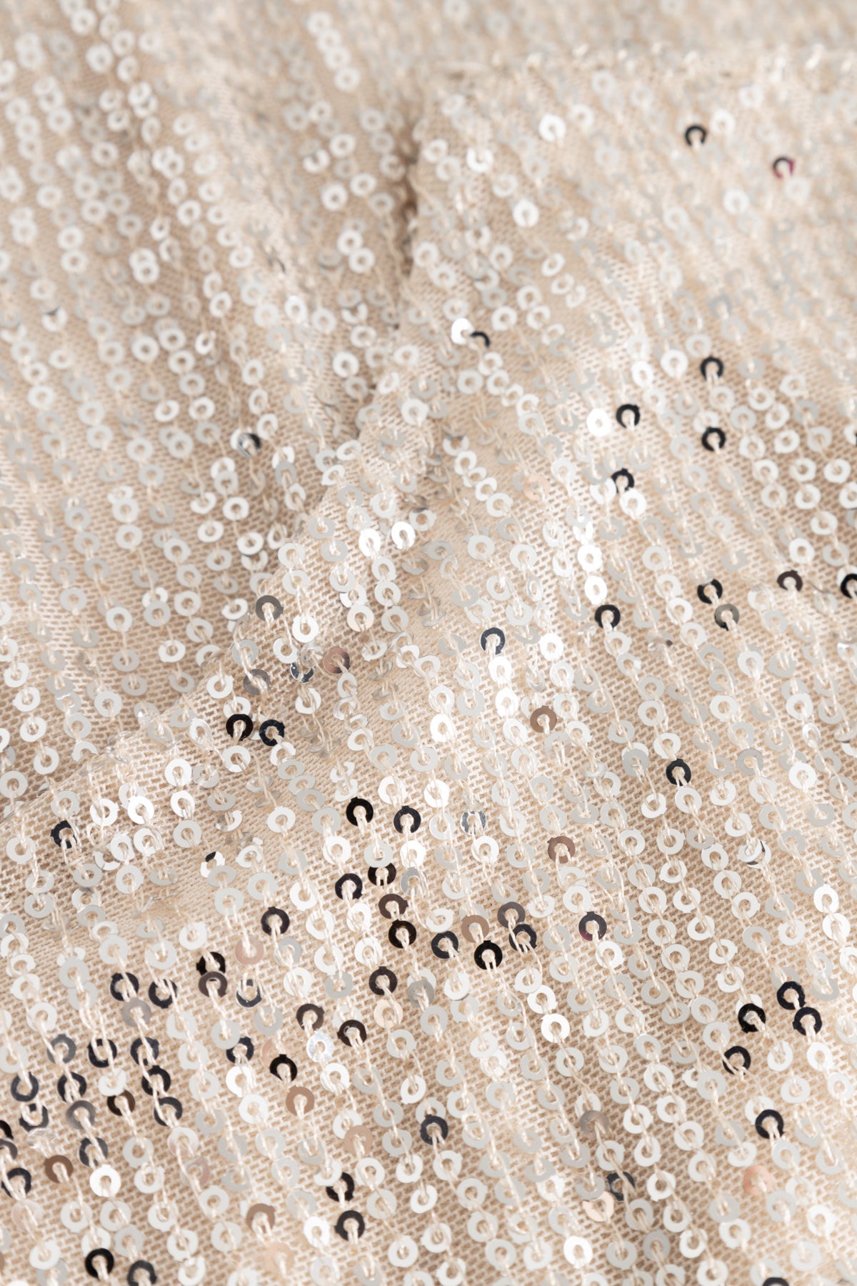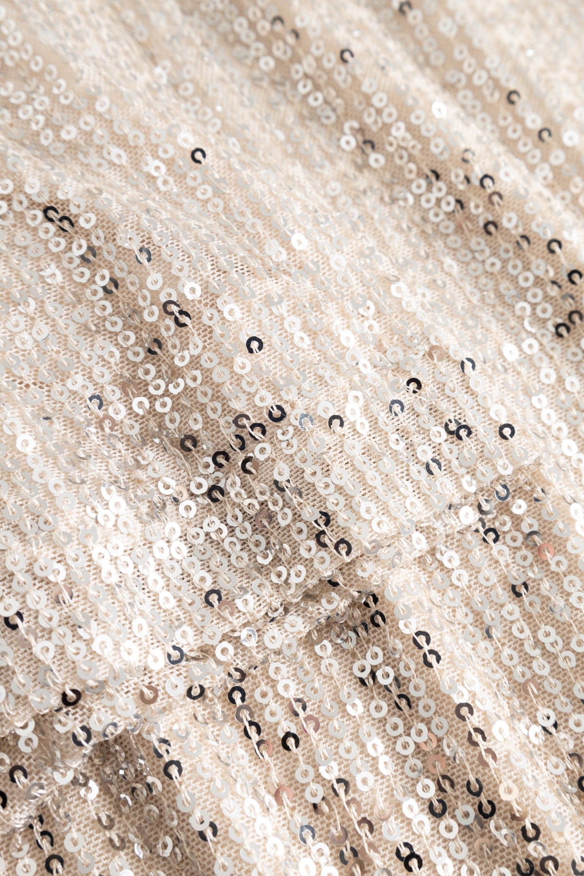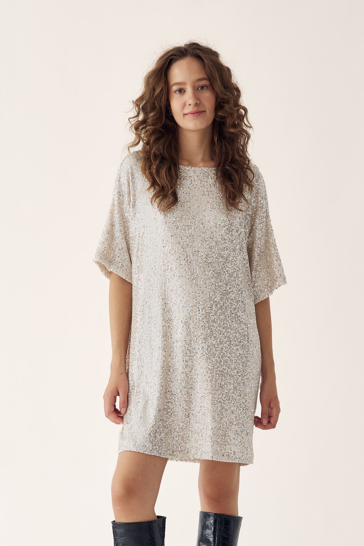 Lorah Dress is a T-shirt style dress with a loose fit, short sleeves, sequins, and a V-back neckline.