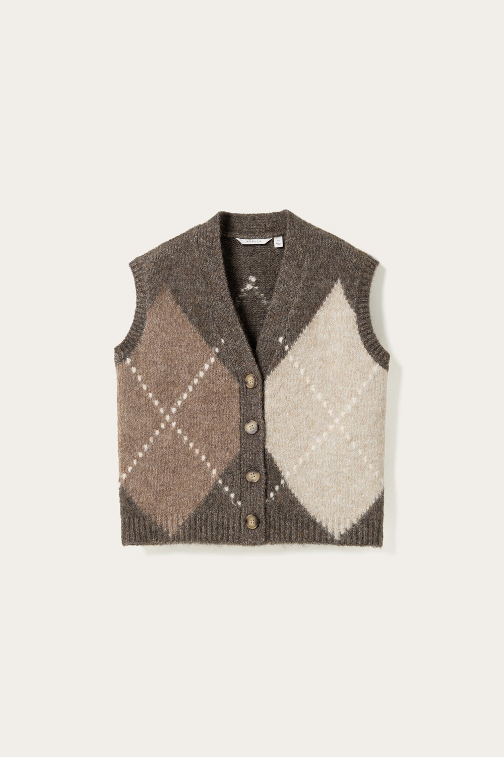 N-Laiana Knit Vest is a loose knitted vest with a classic Argyle-pattern. N-Laiana Knit Vest is designed with a relaxed fit and a slightly cropped length.