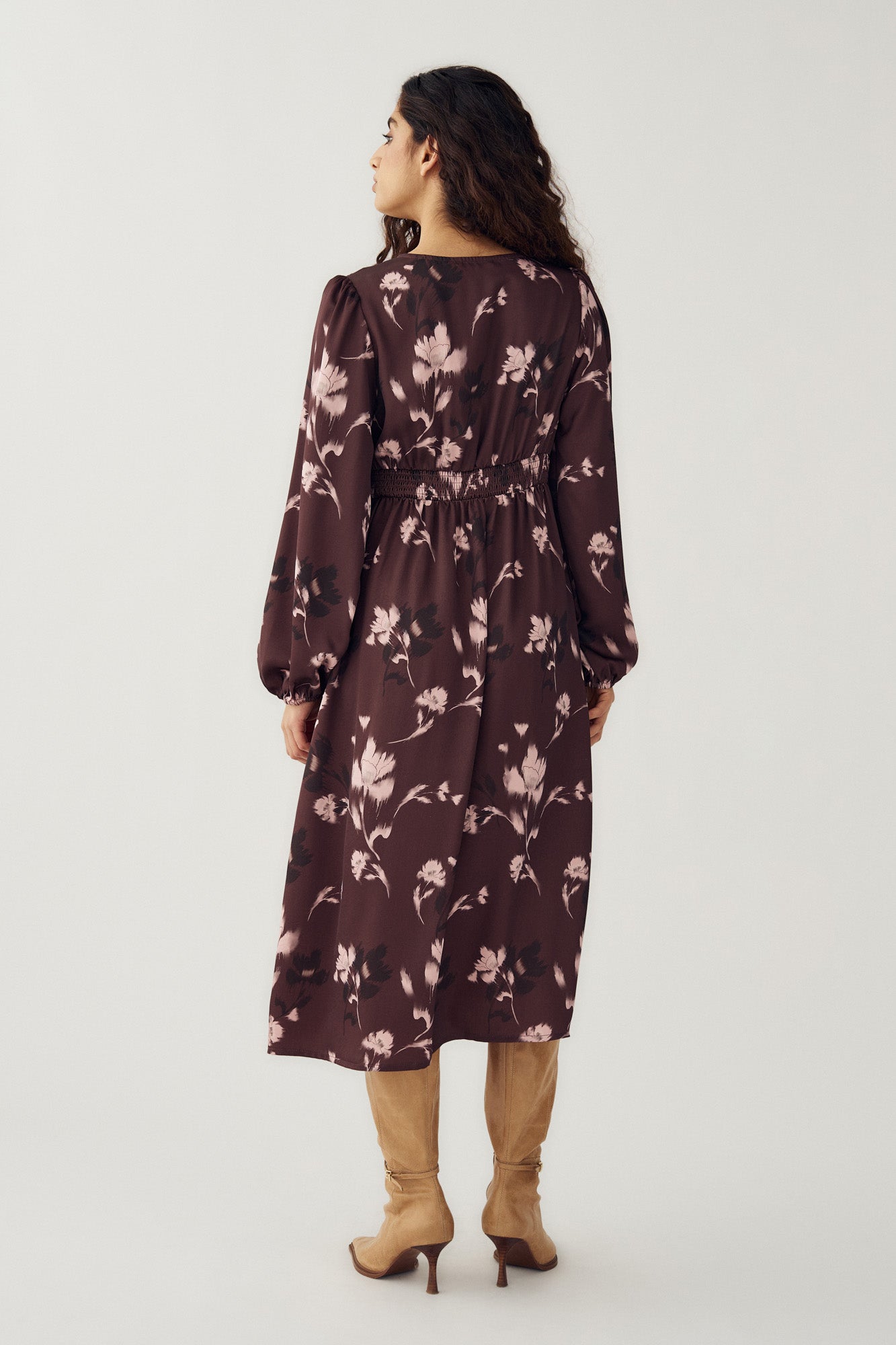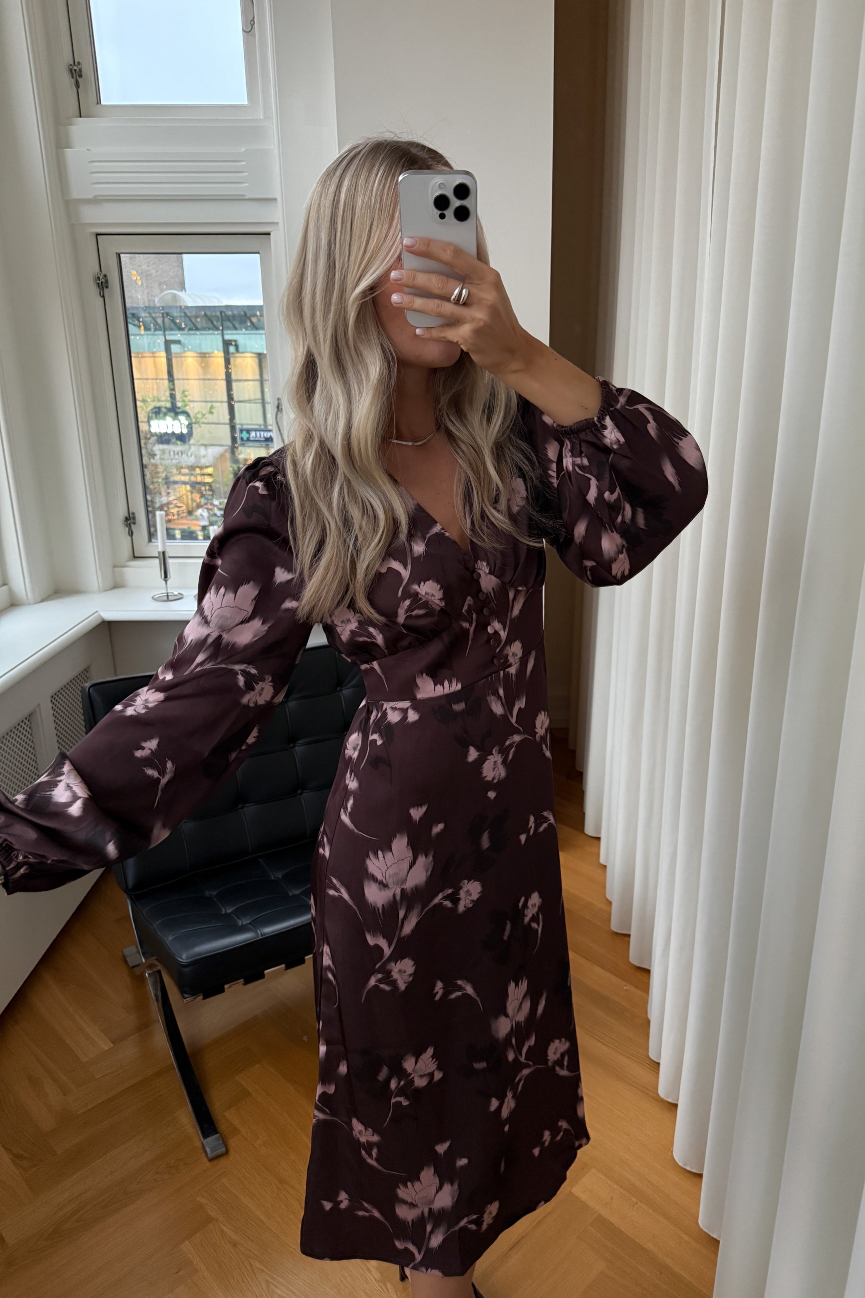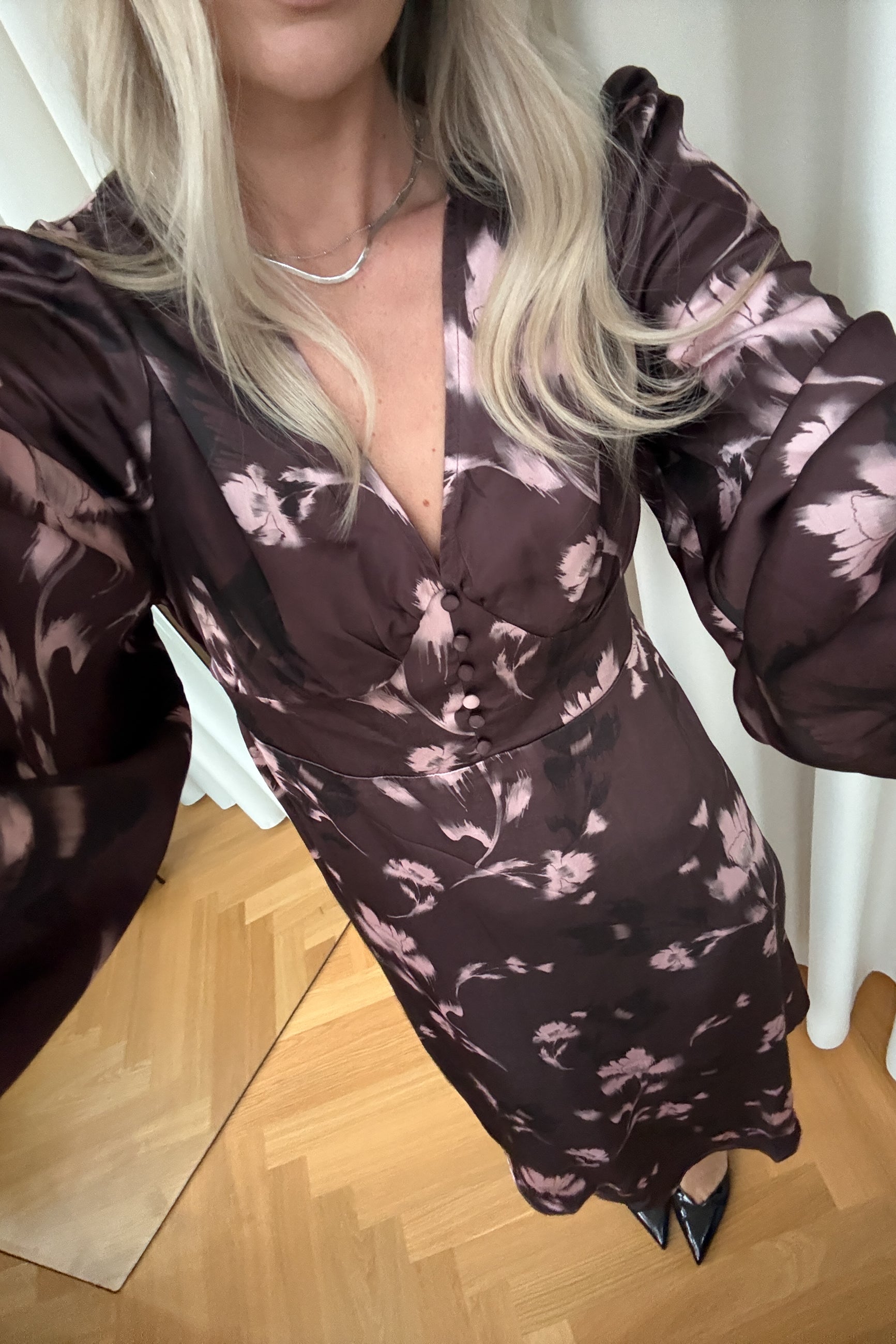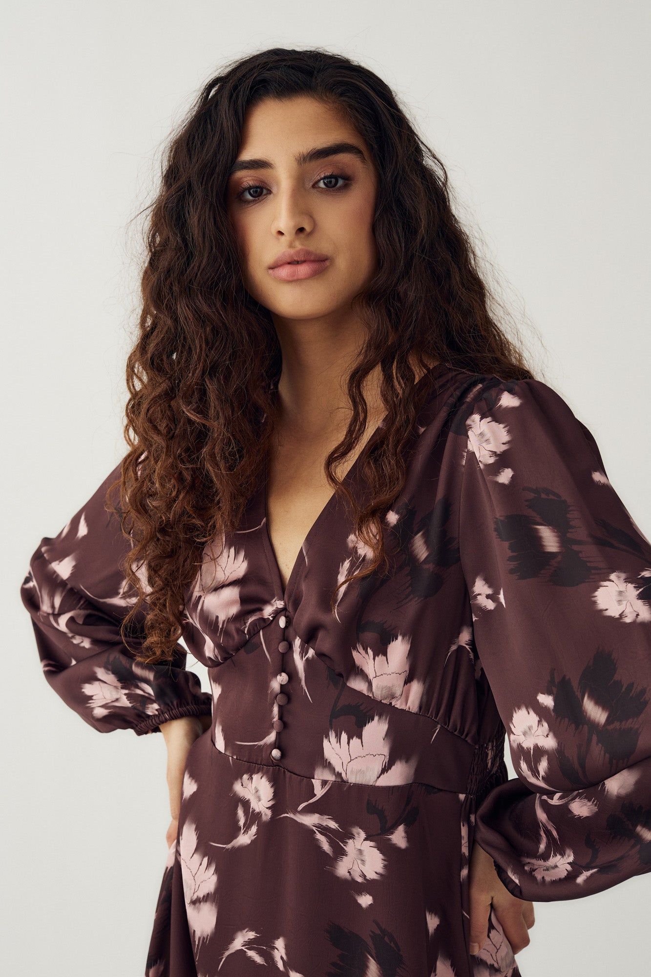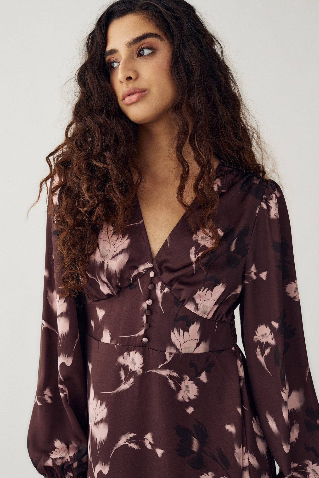 N-Lilith Dress is designed with long sleeves, a defined waist piece, and a flattering V-neckline. The flower pattern and the decorative button detail down the front adds a touch of charm.