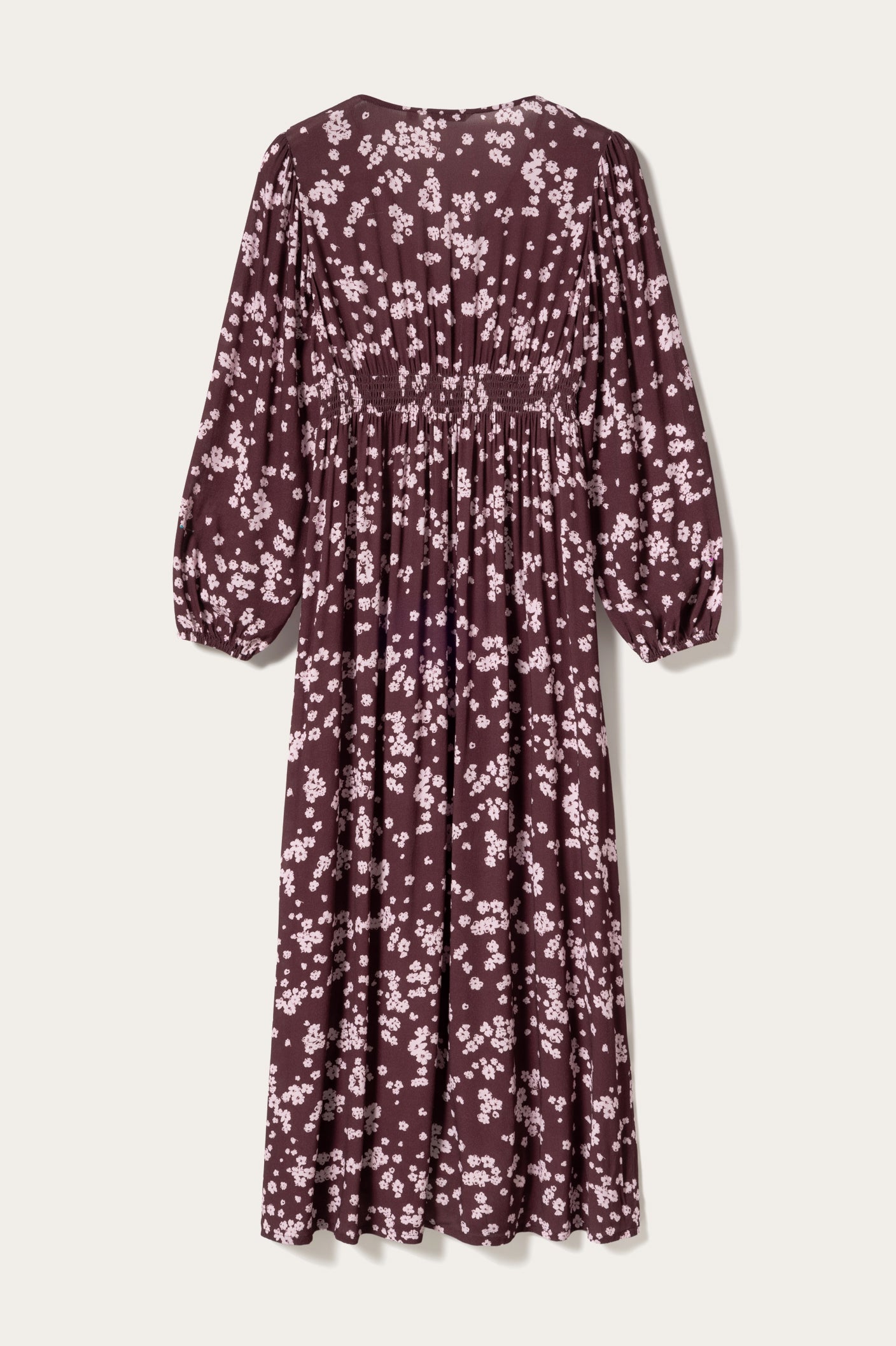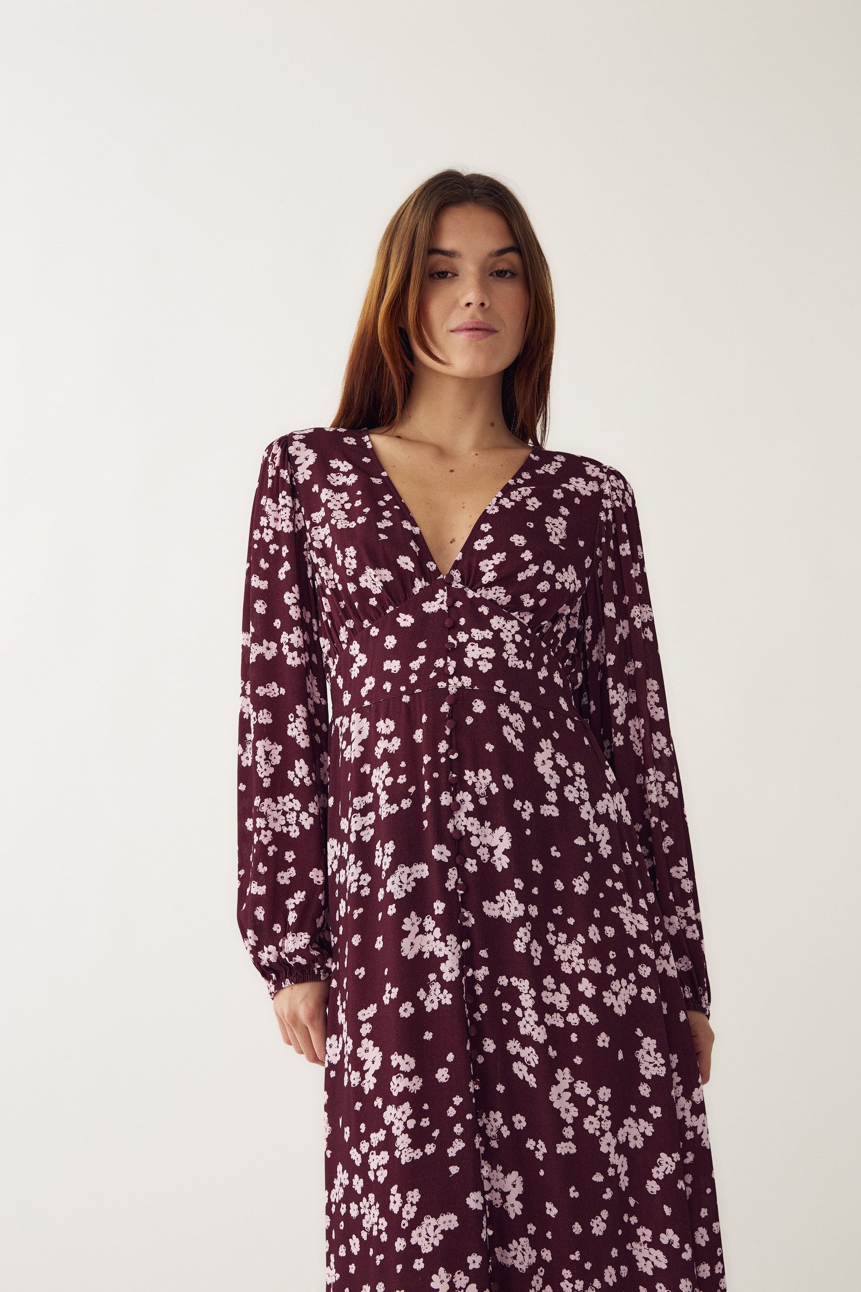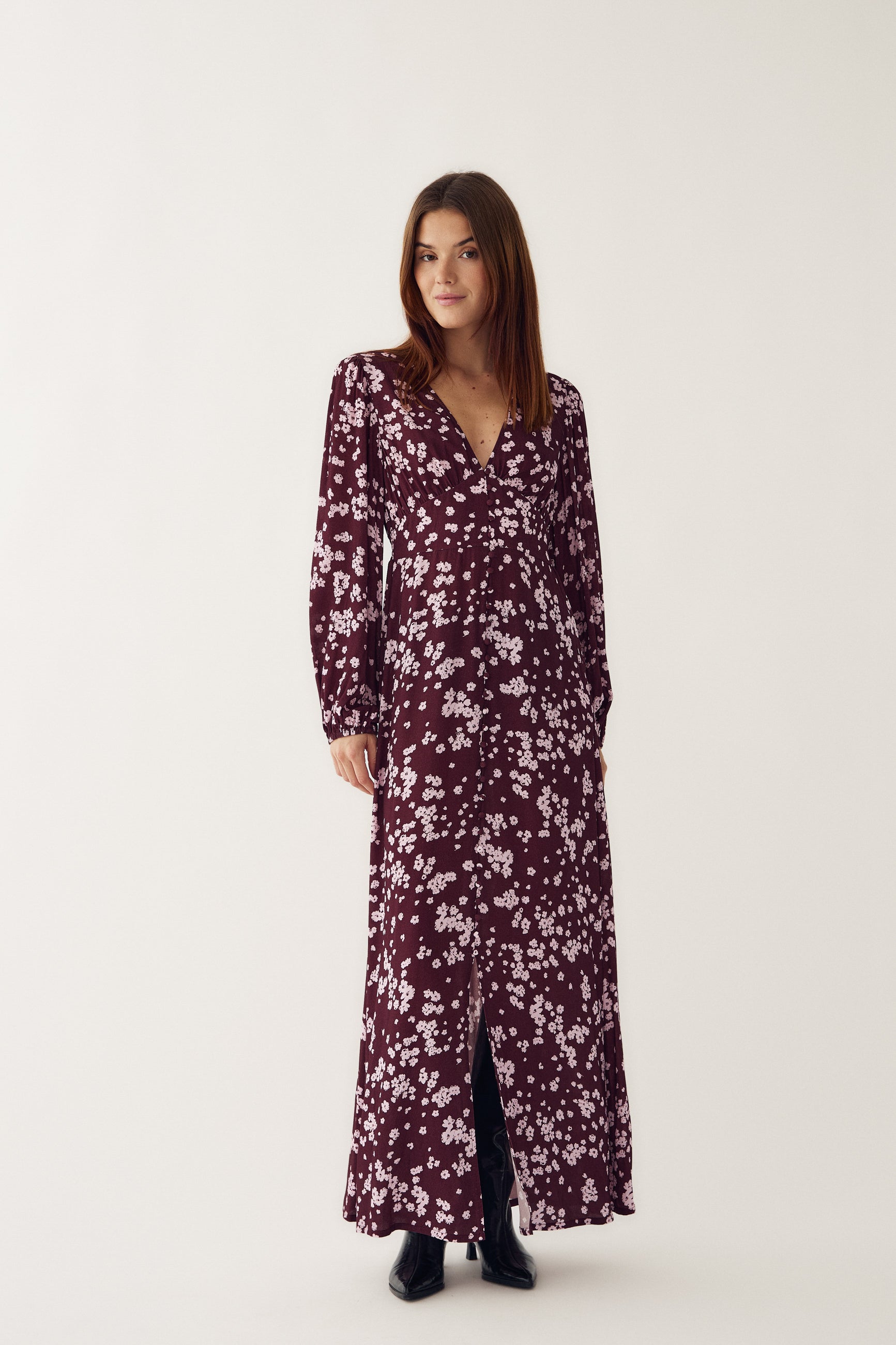 N-Lilith Maxi Dress is designed with long sleeves, a defined waist piece, and a flattering V-neckline. The floral all-over print and the decorative button detail down the front adds a touch of charm.