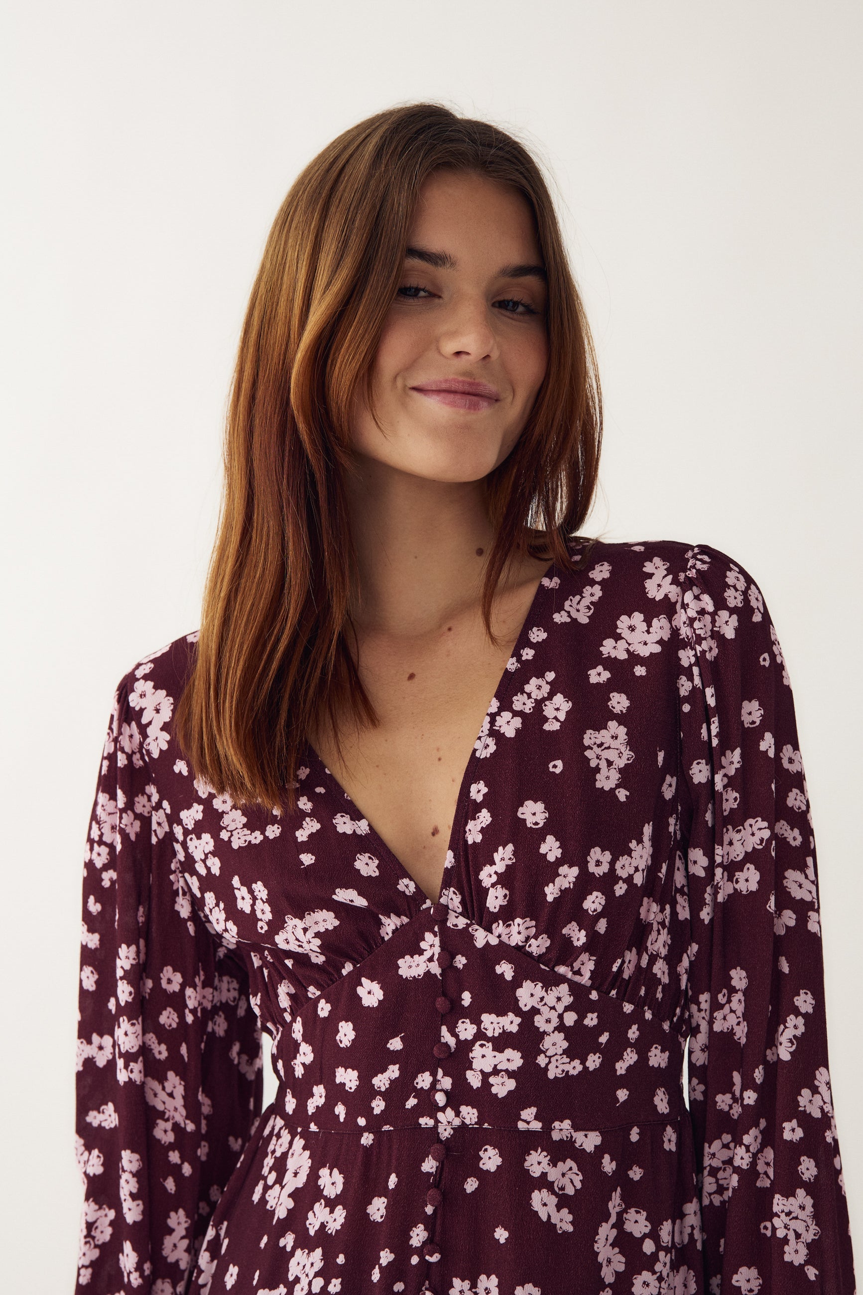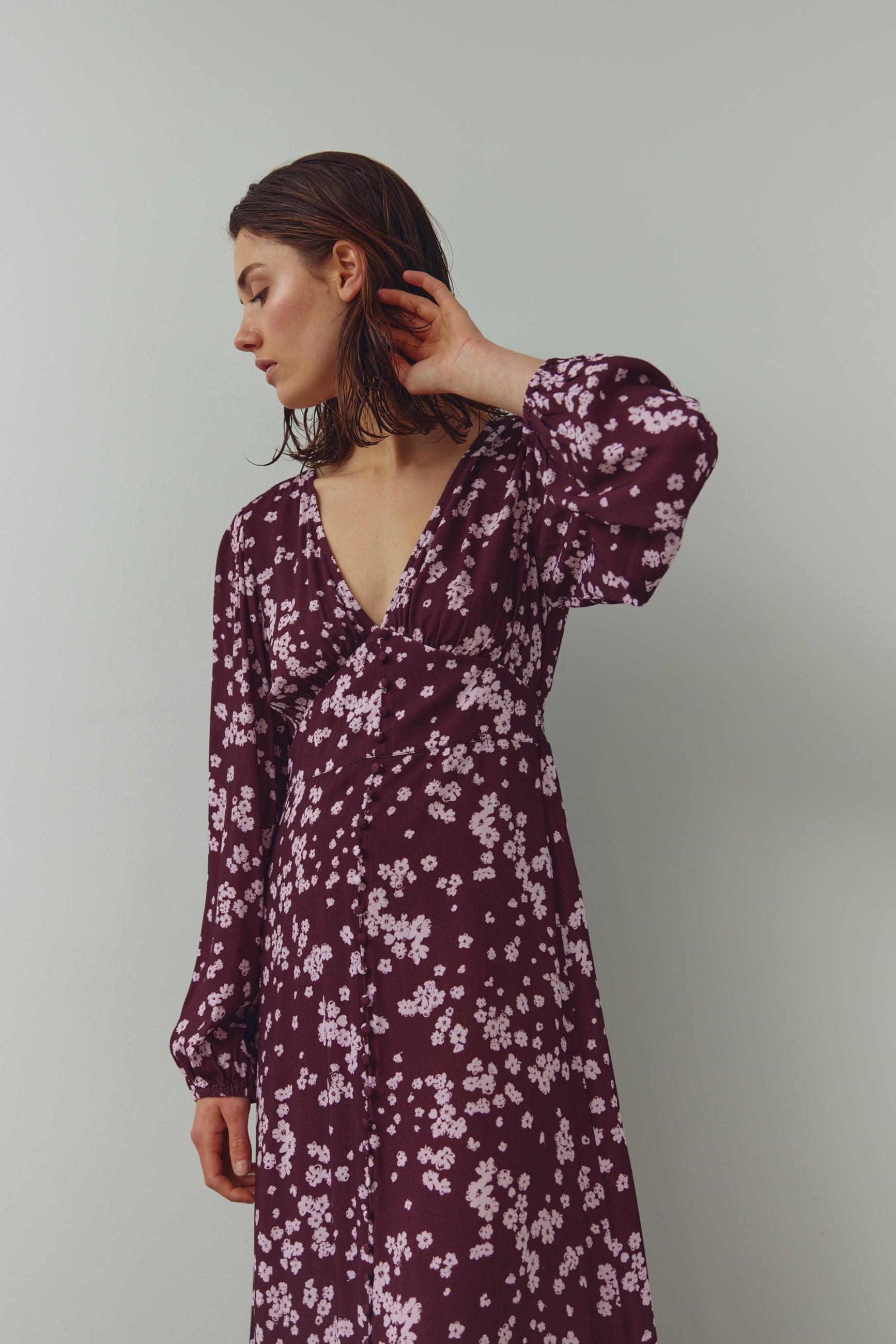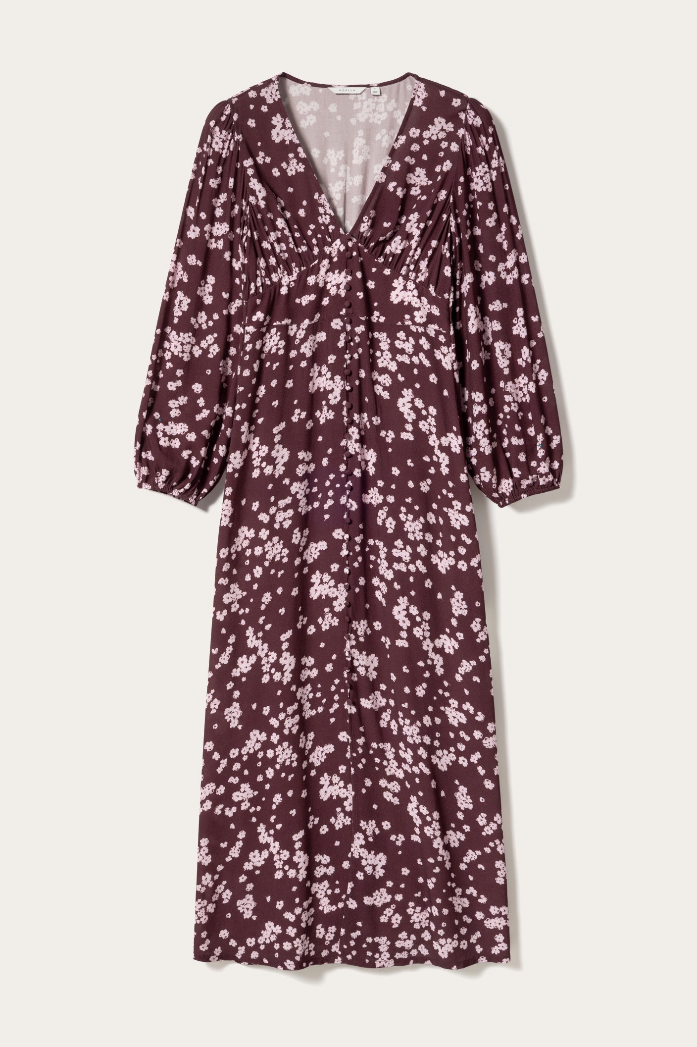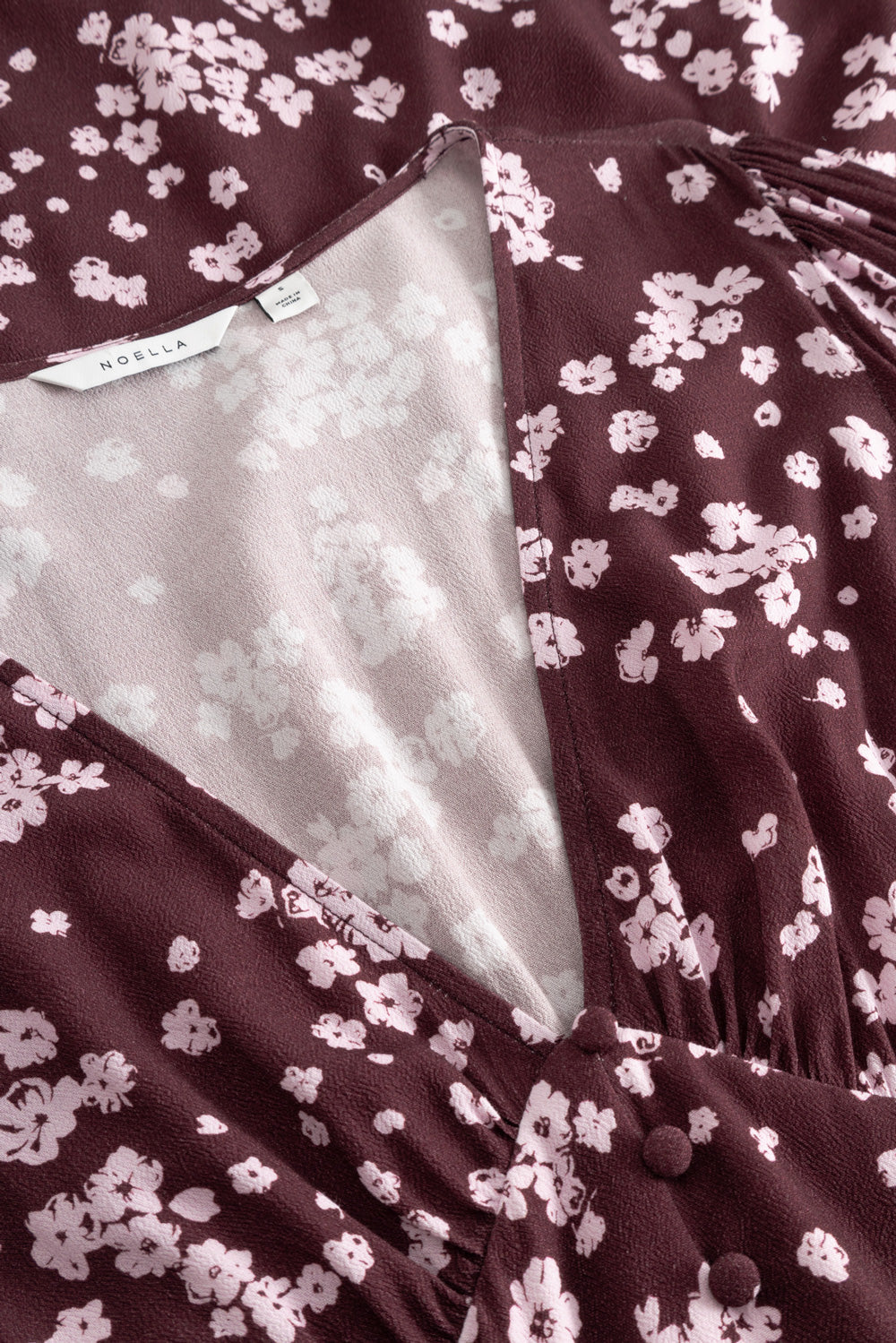 N-Lilith Maxi Dress is designed with long sleeves, a defined waist piece, and a flattering V-neckline. The floral all-over print and the decorative button detail down the front adds a touch of charm.