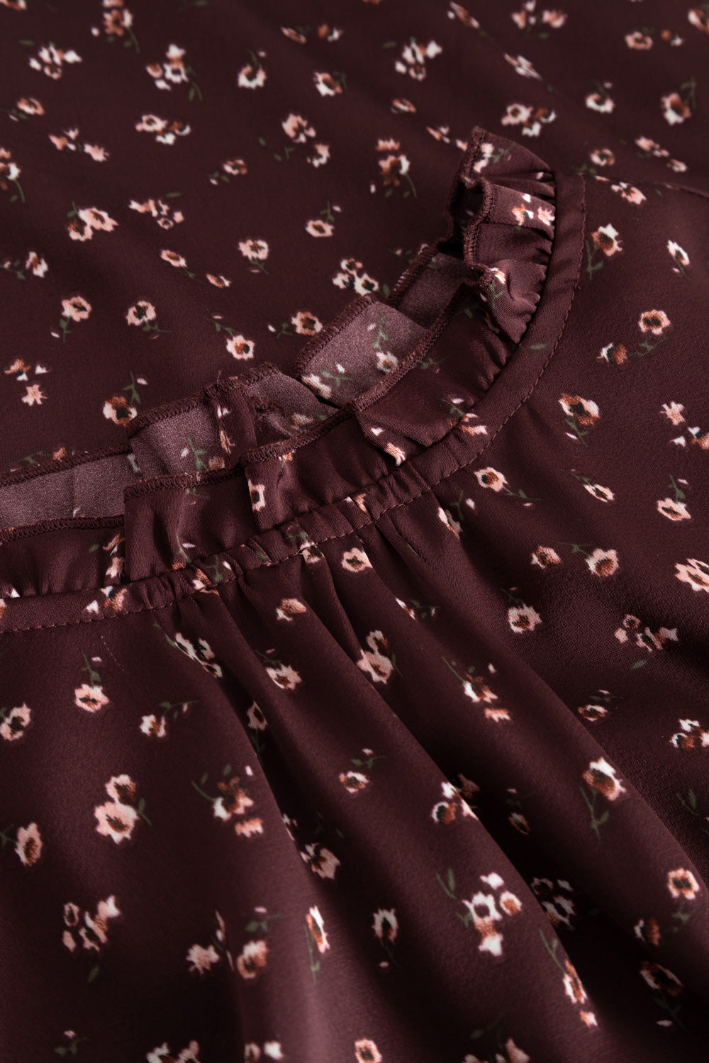 N-Ruth Dress is a long, flowy silhouette featuring puffed sleeves and a cinched waist that flatters the figure. The dress is designed with a ruffled collar and an all-over floral print.